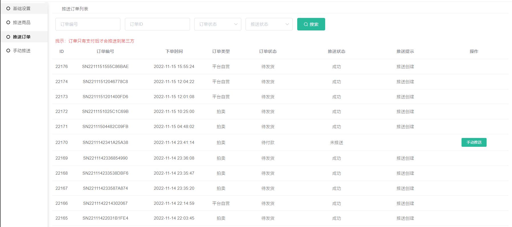只要是前端下单的商品是后台已推送的商品,推送订单列表这里就会有一条记录。
