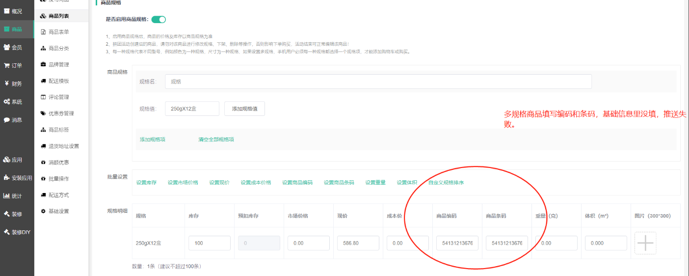 多规格商品,基本信息处的商品编码条码需要填写外,同时规格里面的商品编码、商品条码也需要填写,两者缺一不可,如果只是填写其中一项,会导致推送不全从而导致后续的异常