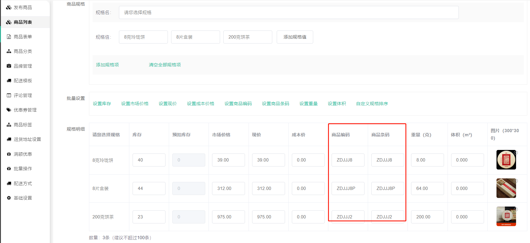 同一个商品同规格内的编码、条码可以填写一样,但不同商品、不同规格之间编码、条码则需要填不一样的,这是推送到第三方那边显示出来的编号,用来区分商品的。编码条码可以随意自行生成填写,也可以根据商品实际的编码填写。