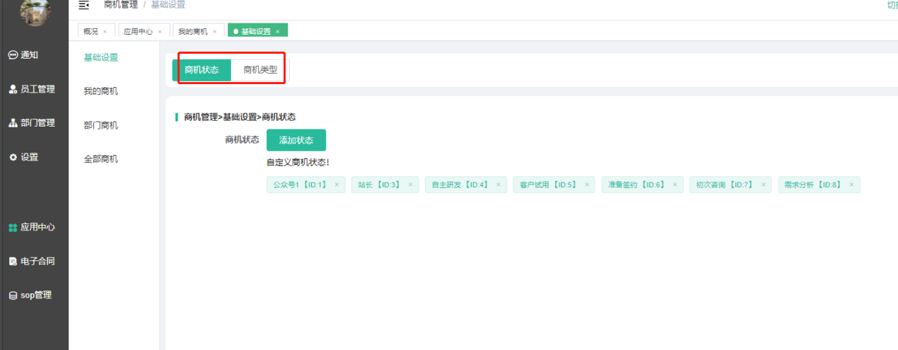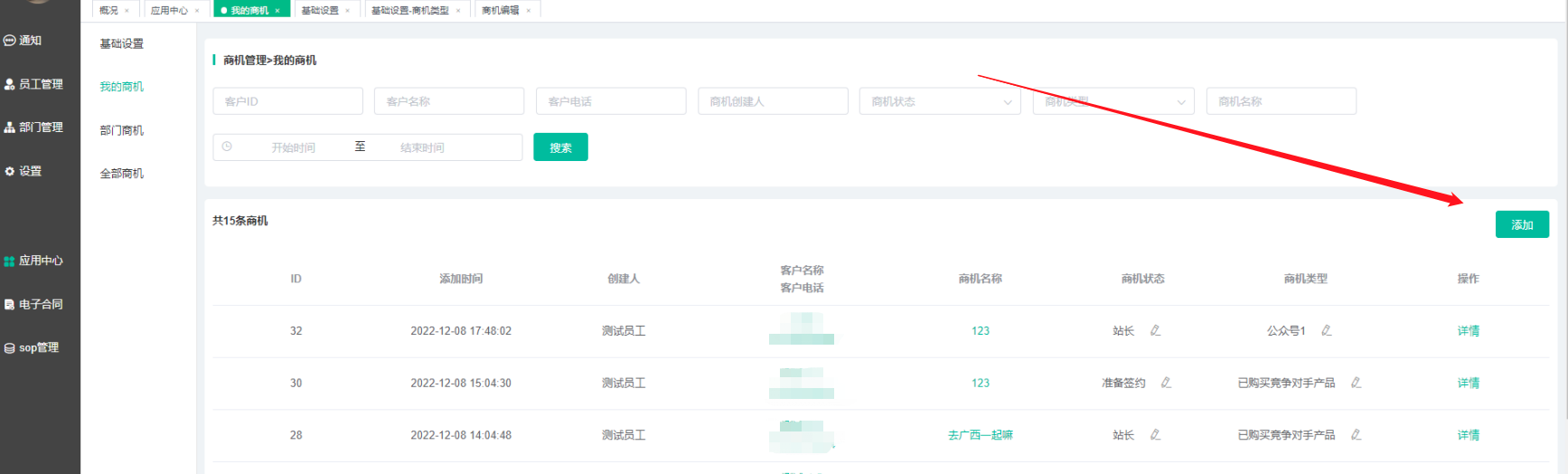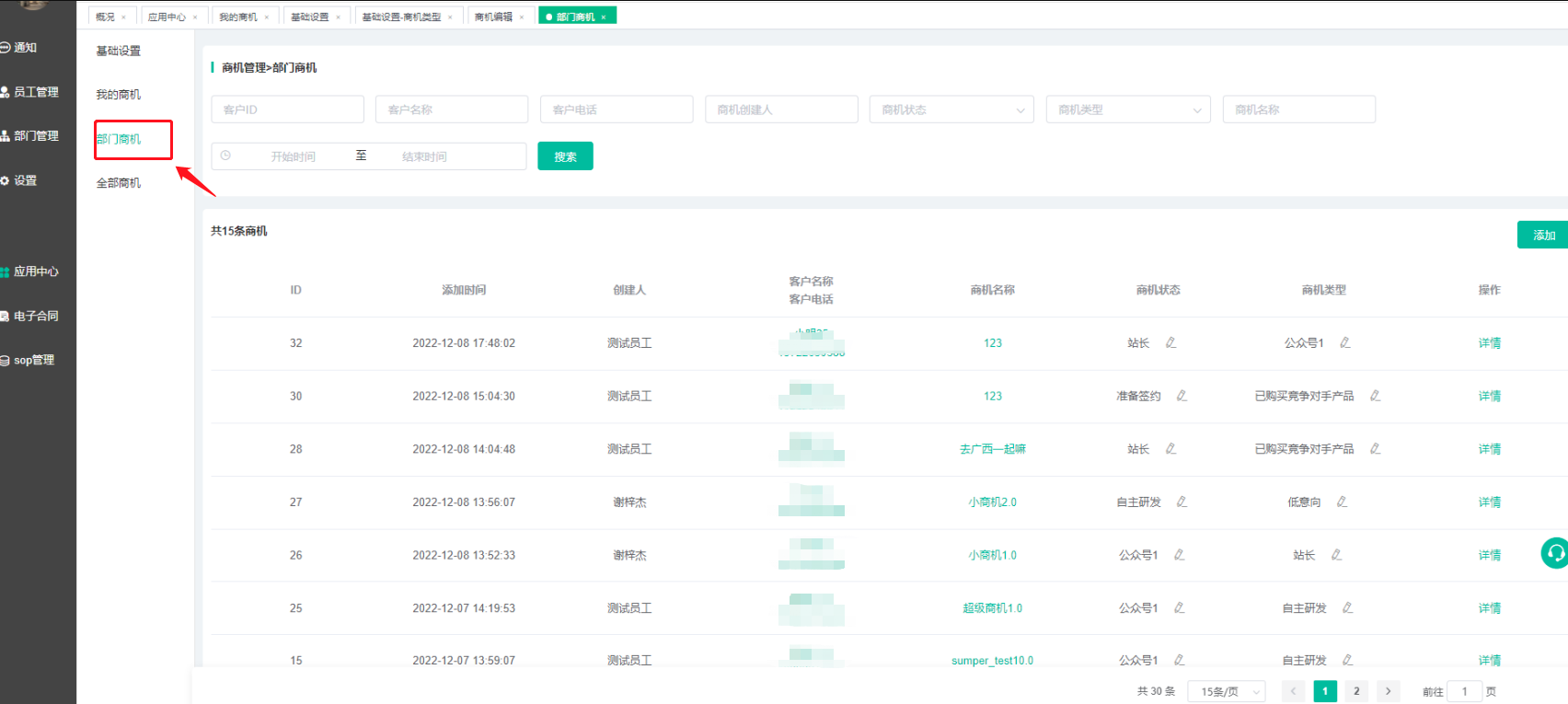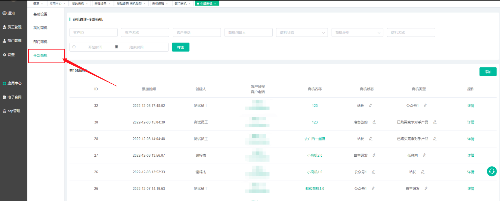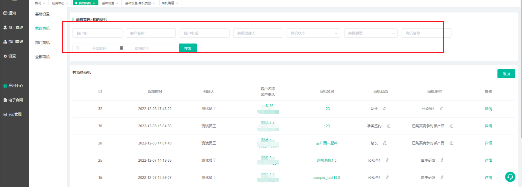 搜索栏:可通过筛选客户id、客户名称、电话、商机创建人、商机状态、商机类型、商机名称、时间来筛选数据