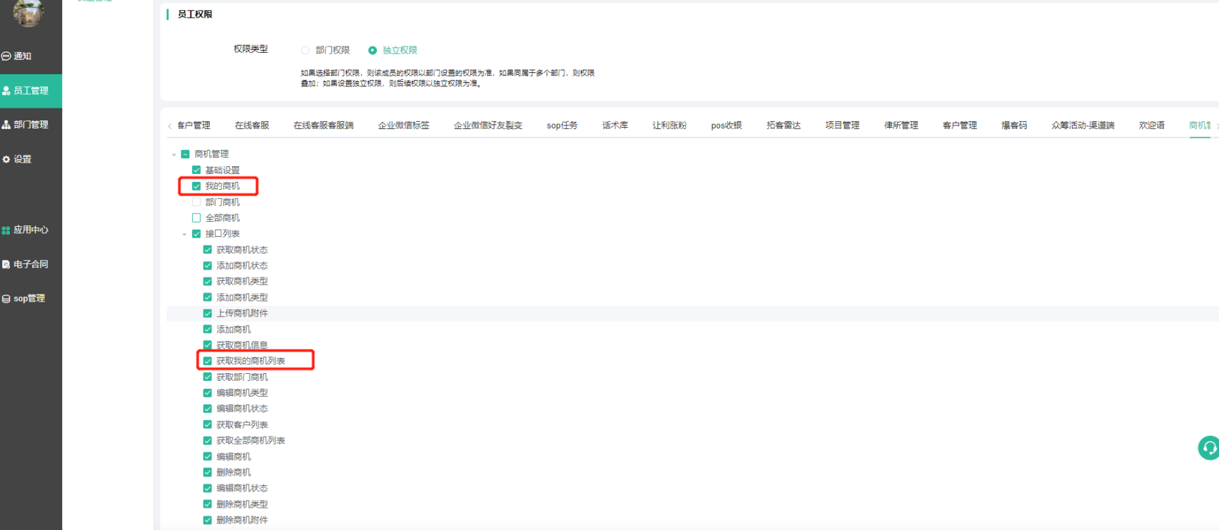 比如开启我的商机,接口列表-获取我的商机列表,也需要勾选上(关闭同理)