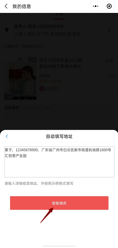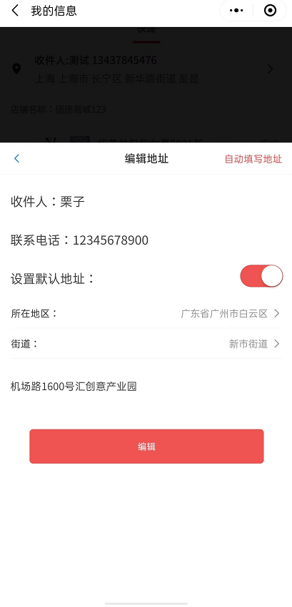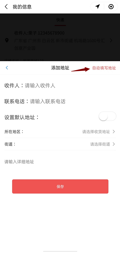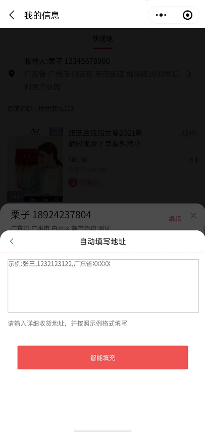 预下单页,添加地址或者编辑地址的时候,左上角有个自动填写地址,把地址信息复制到输入框,确认填充就可以了