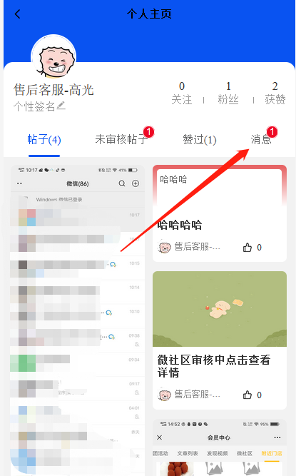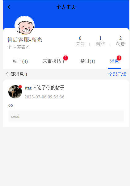路径:微社区 — 我的主页 — 增加评论消息通知,但有用户对帖子进行评论,帖子发布者会看到有消息通知,效果如下图