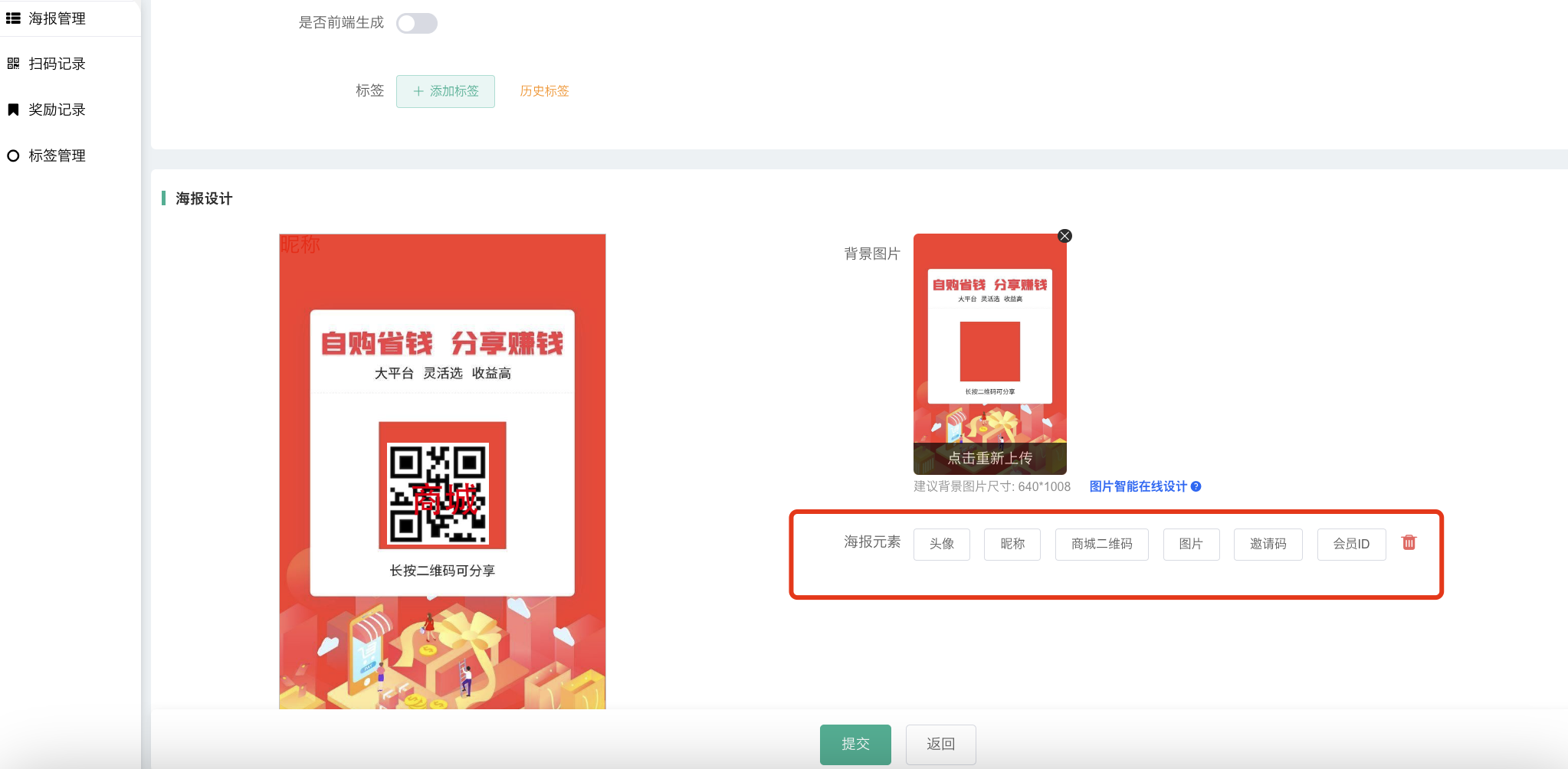 注意:使用海报中心功能,需要商城有配置云存储(远程附件)且配置好跨域,海报中心生成海报需要前端生成的,没有则使用不了,生成海报会出现不显示背景图~
