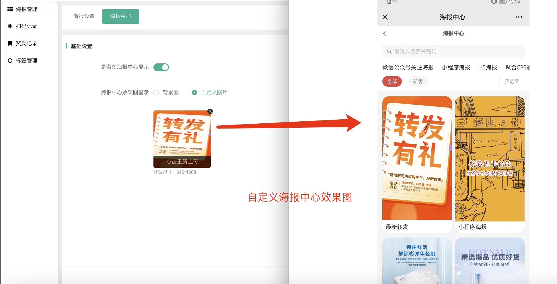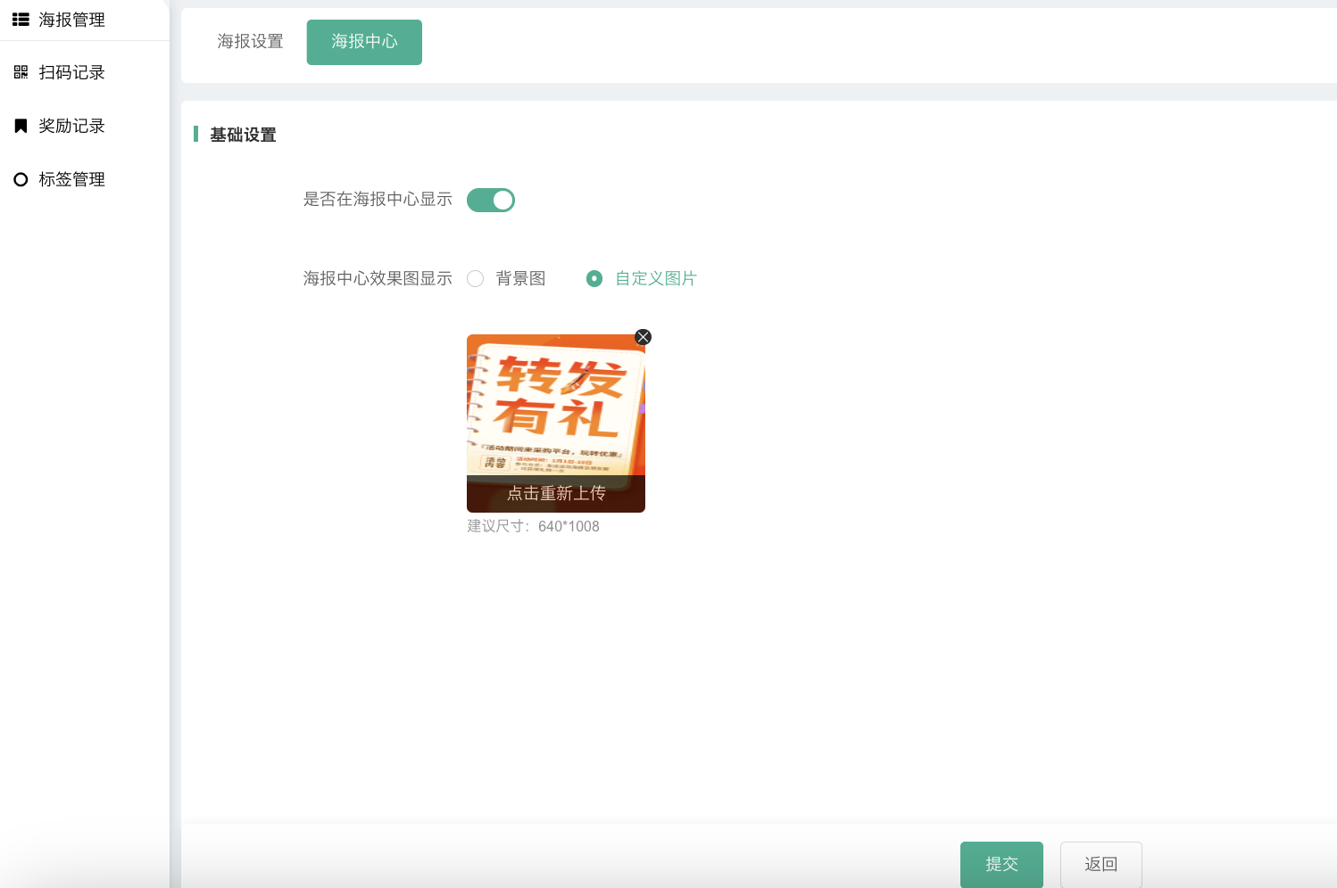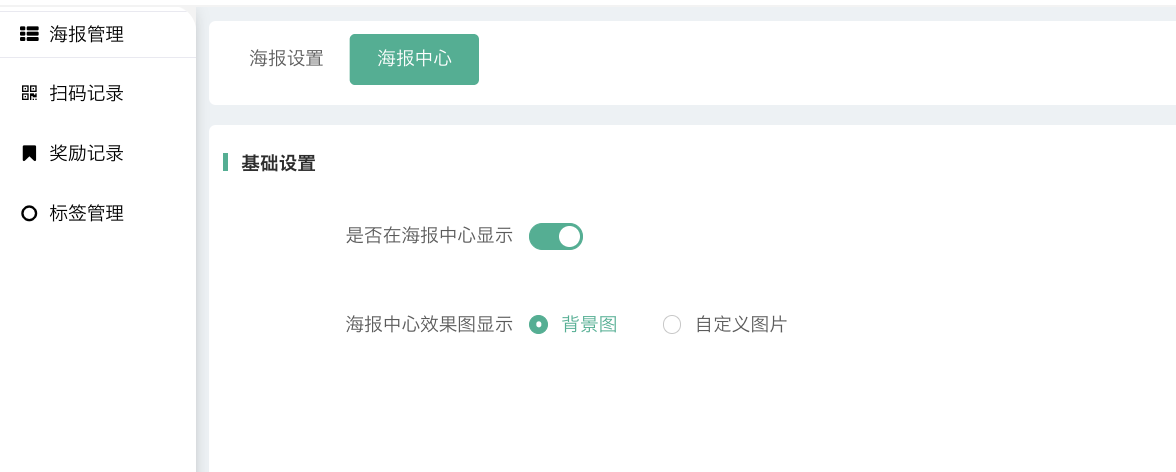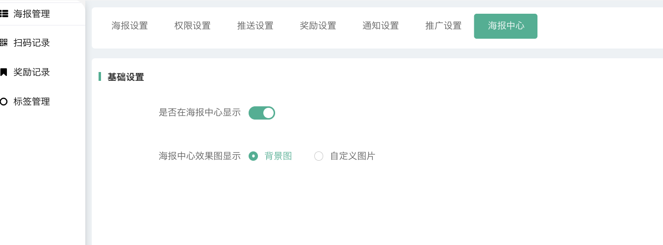 后台可以自定义海报中心效果图,默认是选用海报背景图。