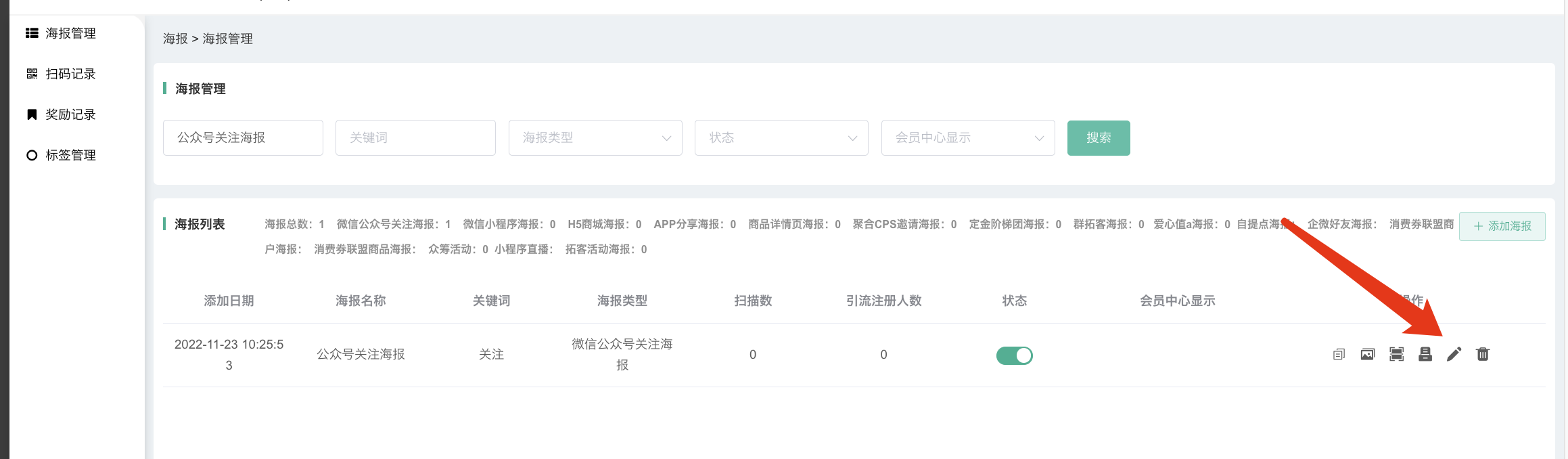 功能概述:结合新海报插件使用,将微信公众号关注海报、小程序海报、H5海报、APP分享海报、聚合CPS海报、APP海报聚合在一个页面上,可以按照类型、标签分类;