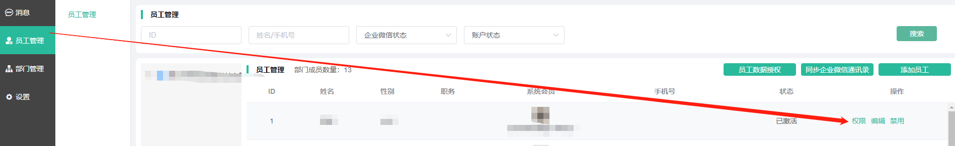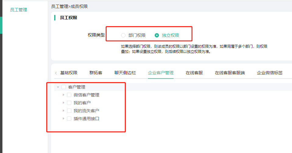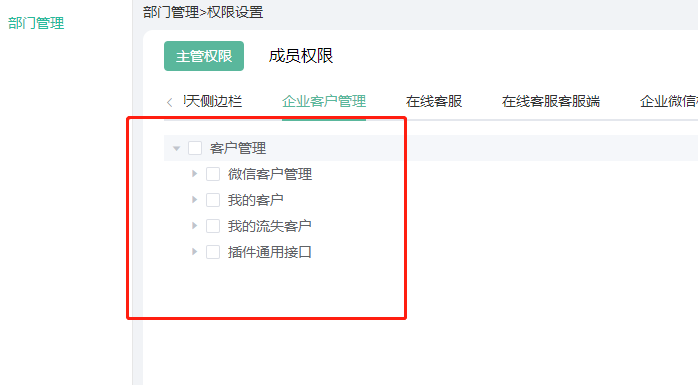 3、在权限中增加我的客户、我的流失客户权限,可以给指定的部门、员工(可以直接走部门权限或者单独设置独立权限)开放这两个列表的参看权限。