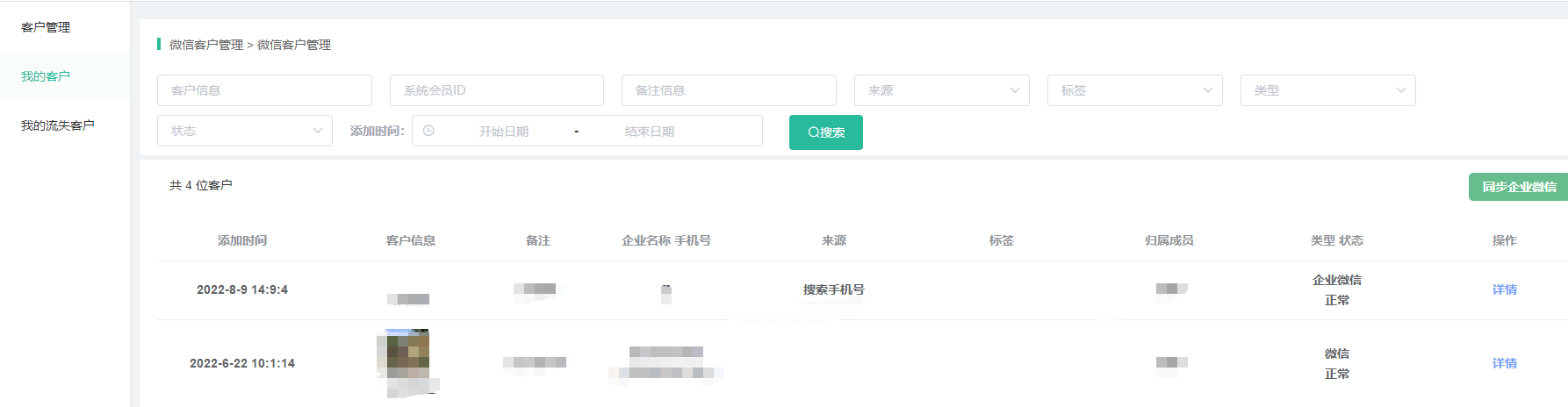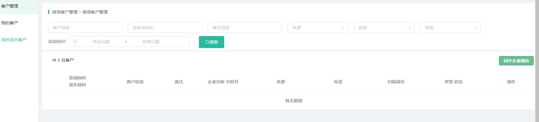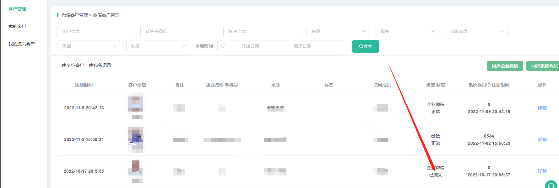 2、我的流失客户,显示当前登录员工的企业微信客户中已流失的客户,即在客户管理中搜索该员工+已流失的状态