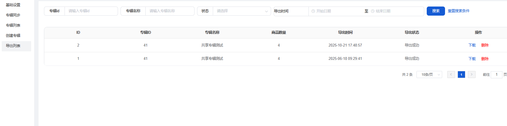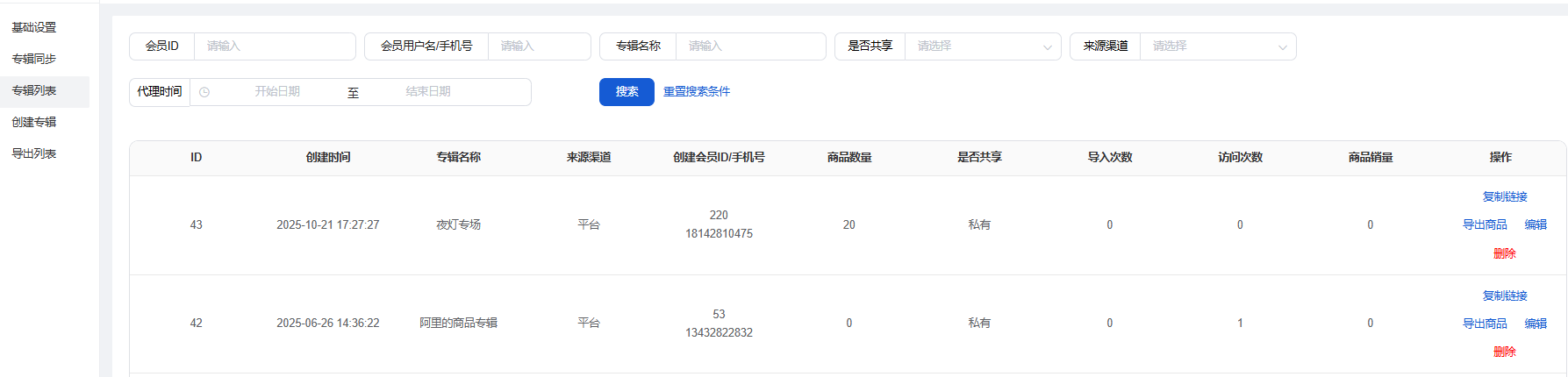 显示所有已经创建的专辑列表,支持后台复制链接,编辑专辑,是否共享,导出商品等功能