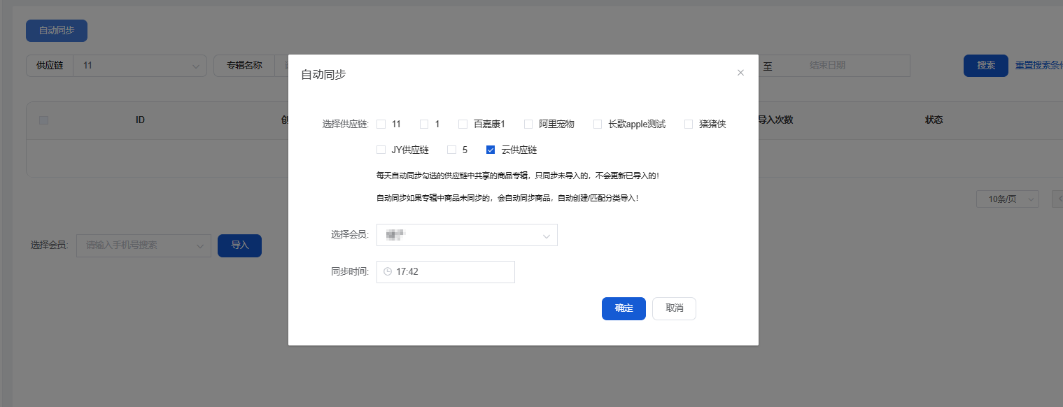 自动同步,只显示中台供应链,选择需要同步的供应链,设置自动同步时间,每天自动同步