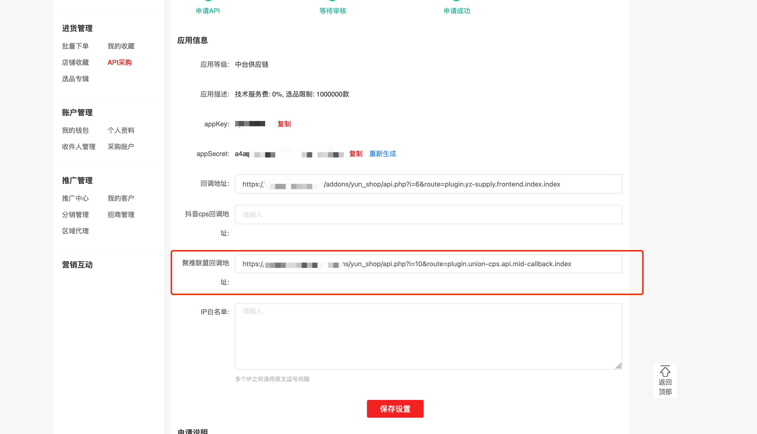 申请采购端后,如果需要使用聚推联盟资源,需要在采购端中单独填写回调地址。