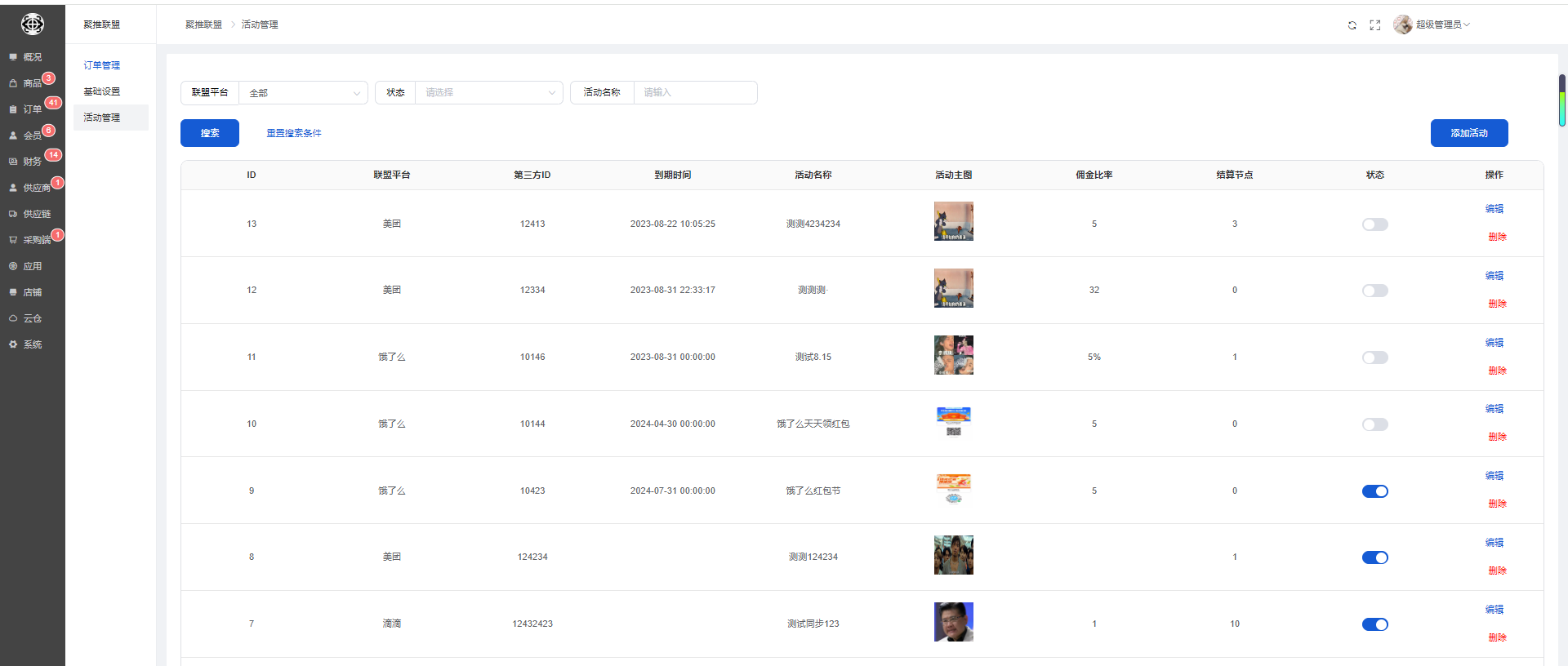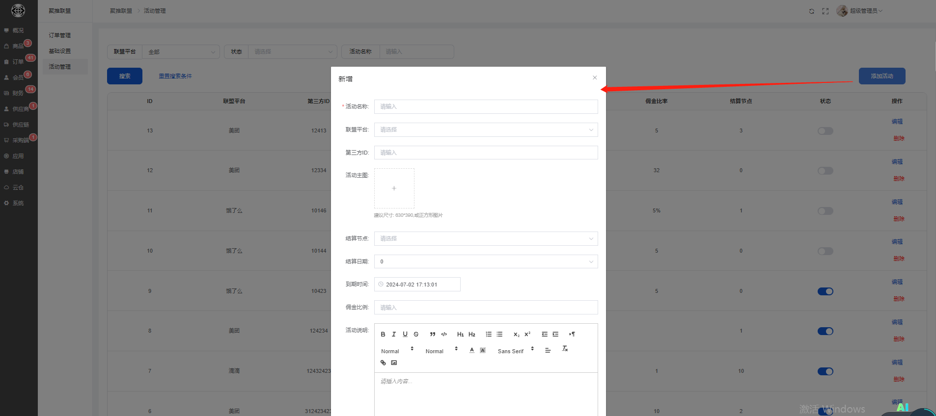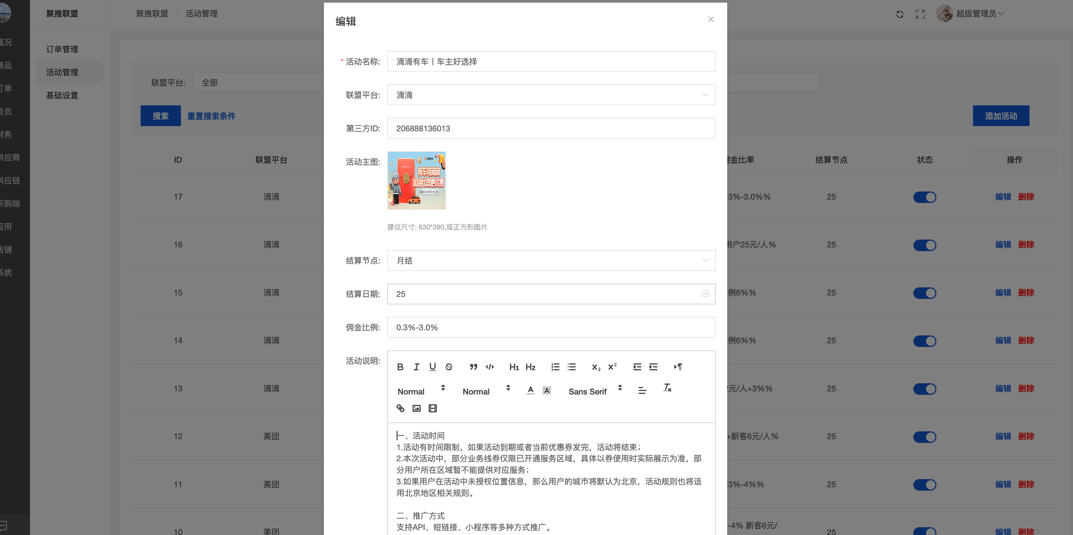 支持对接美团、滴滴等联盟平台,添加联盟活动,同步给商城推广引流。