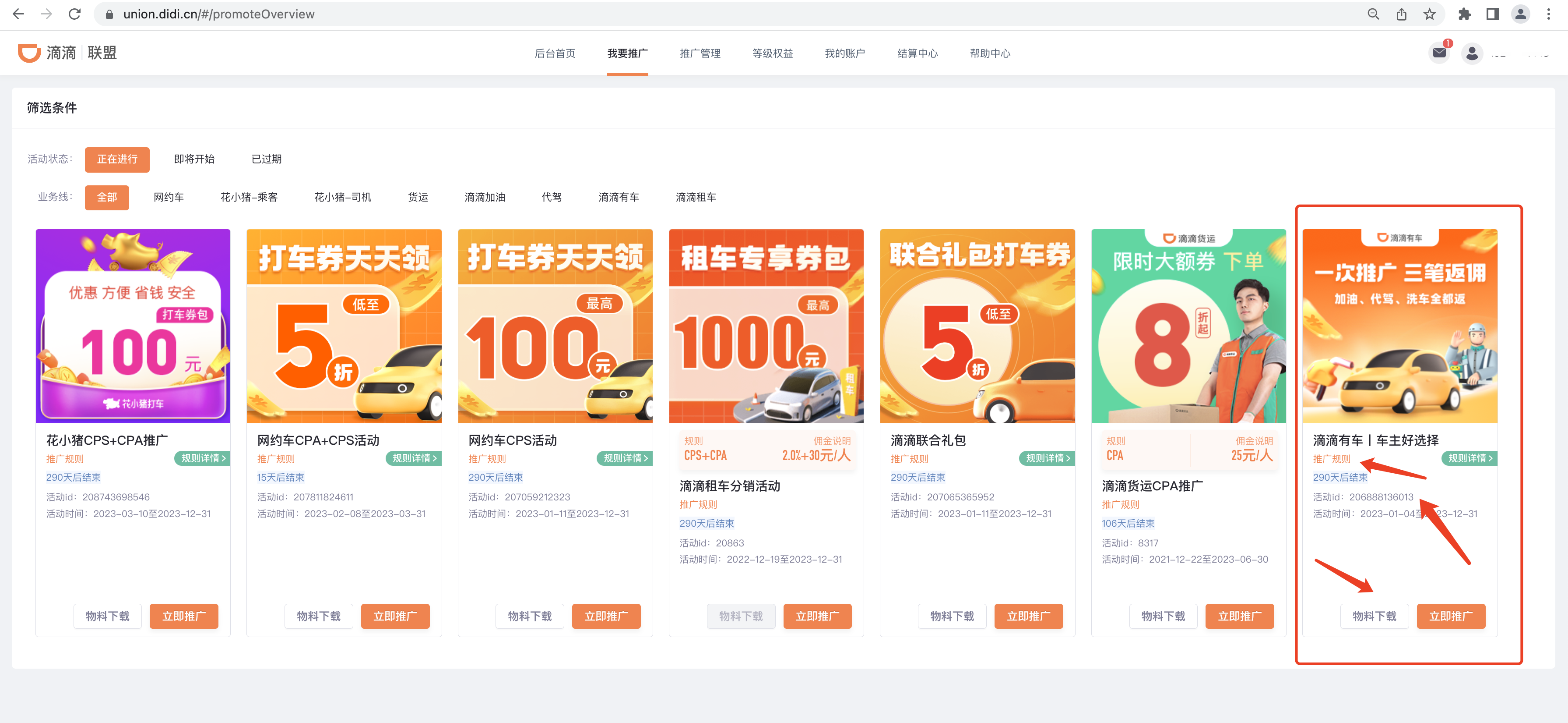 箭头位置对应活动ID、推广规则、物料下载,其他联盟平台都类似。