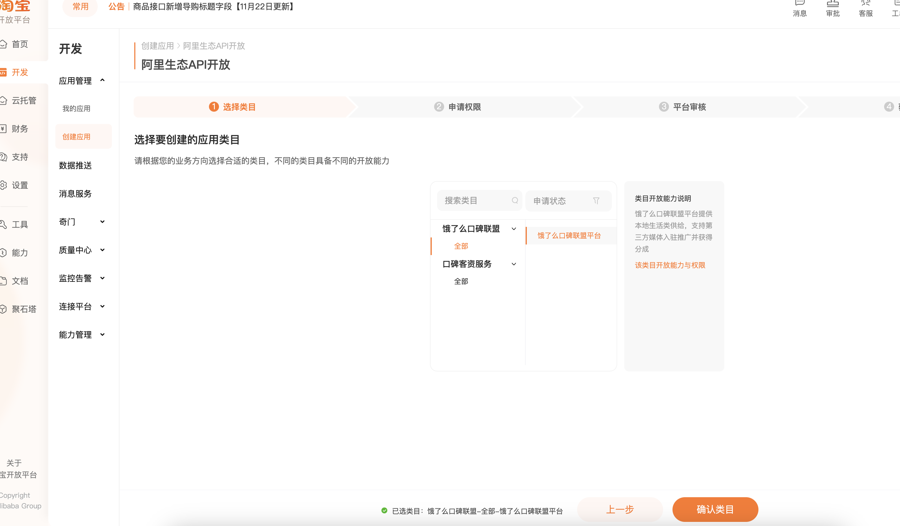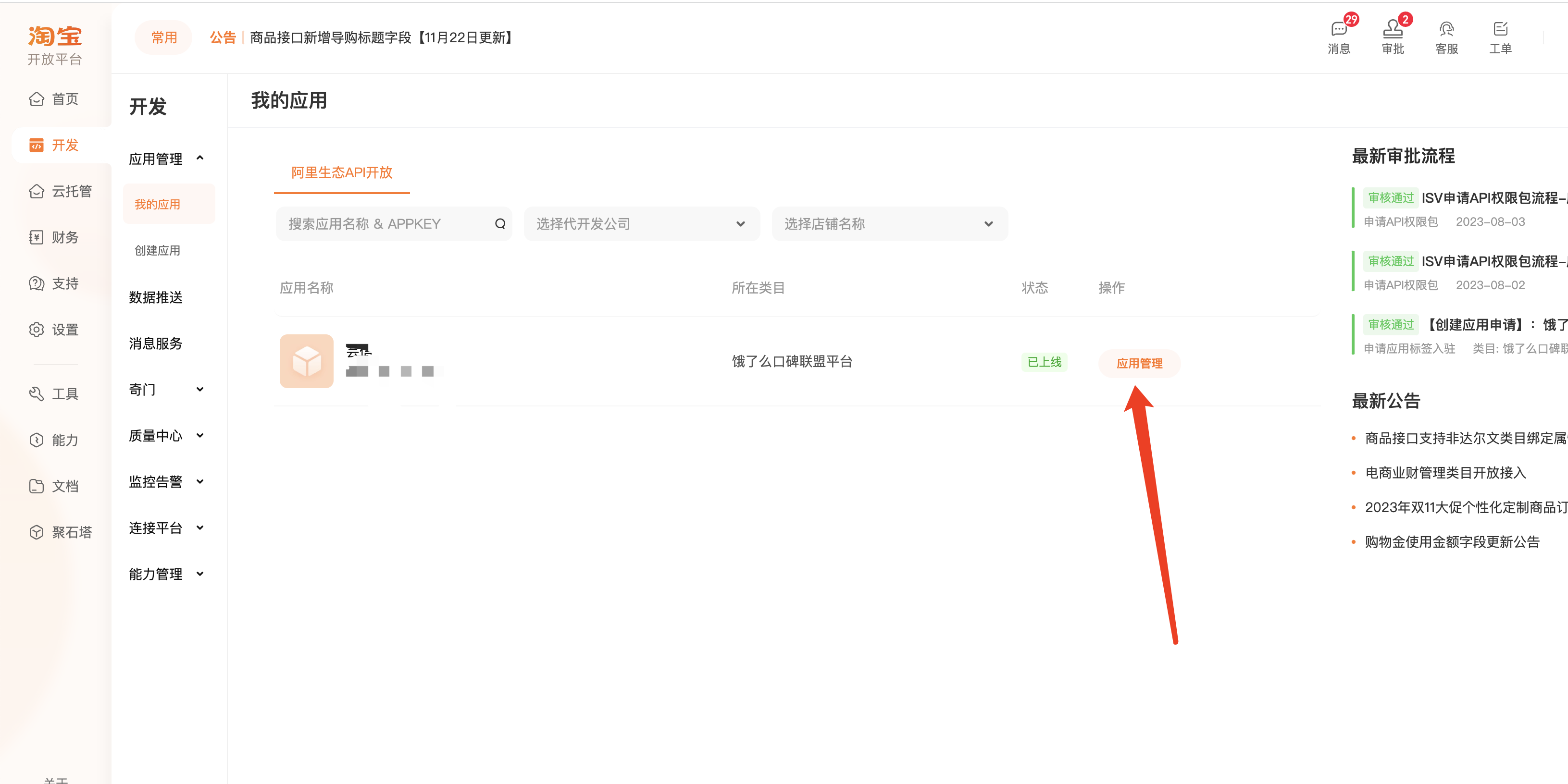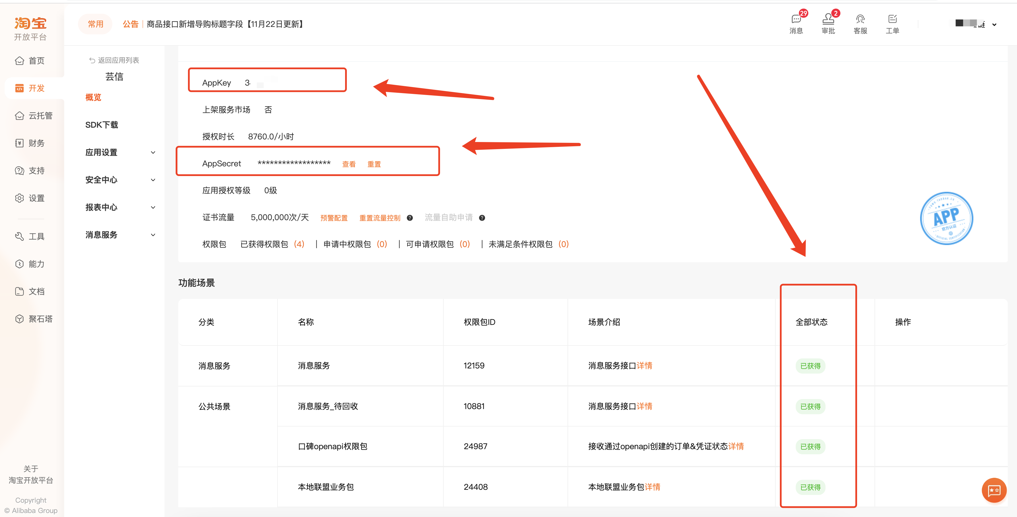 (2)在应用管理中查看appkey、密钥信息,请确认您已经获得全部的权限!