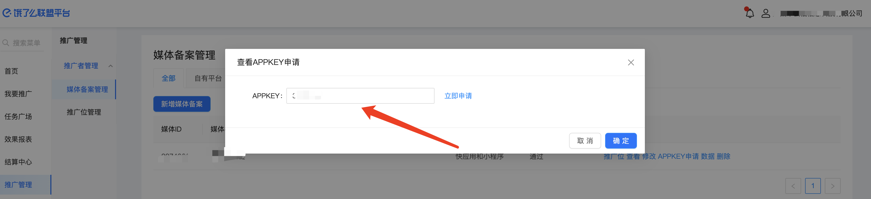 appkey、密钥为淘宝开放平台申请的应用对应的 appkey、密钥,注意appkey必须和饿了么联盟平台中的媒体绑定。