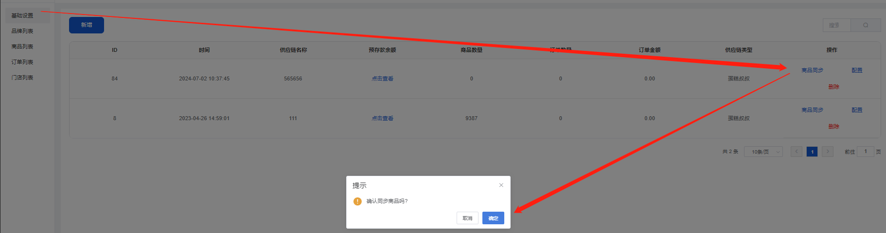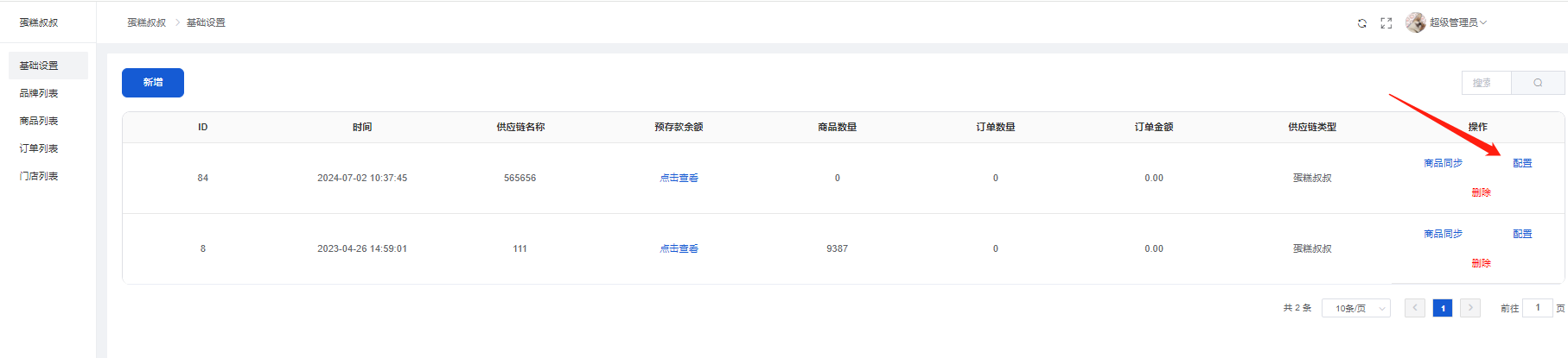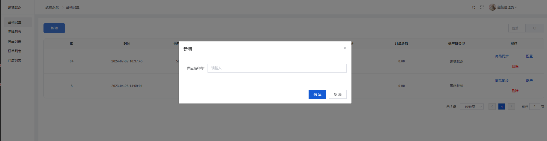 新增–填写供应链名称–确认后点击配置进行填写蛋糕叔叔相关配置信息,配置好信息后点击商品同步