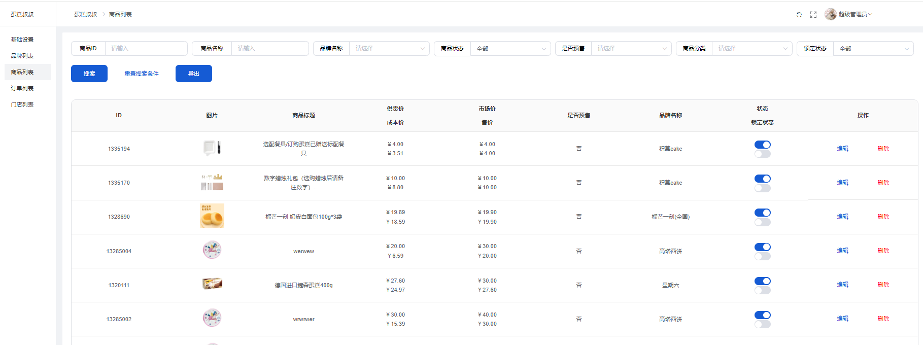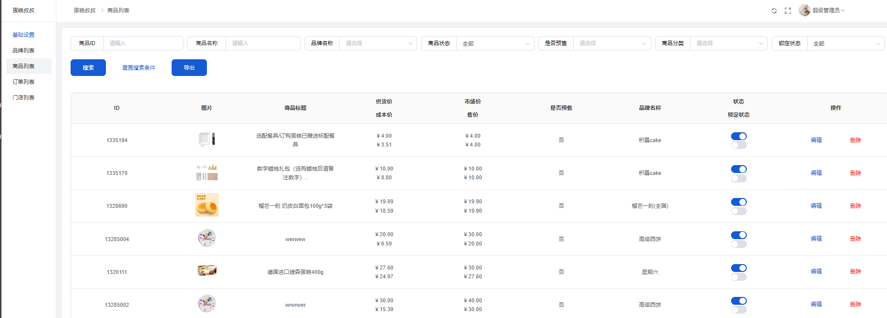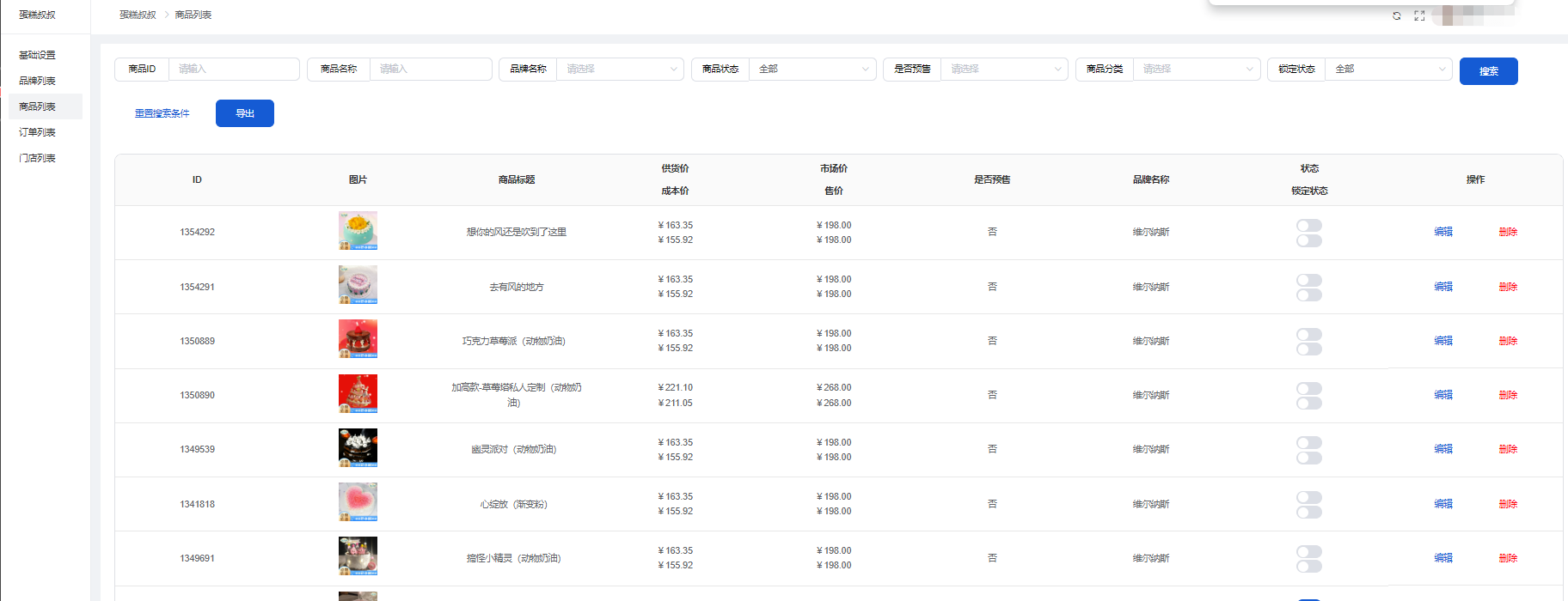 支持输入商品ID、商品名称、品牌名称、商品状态、是否预售、商品分类、锁定状态进行搜索商品,支持商品导出、删除商品、编辑商品功能。