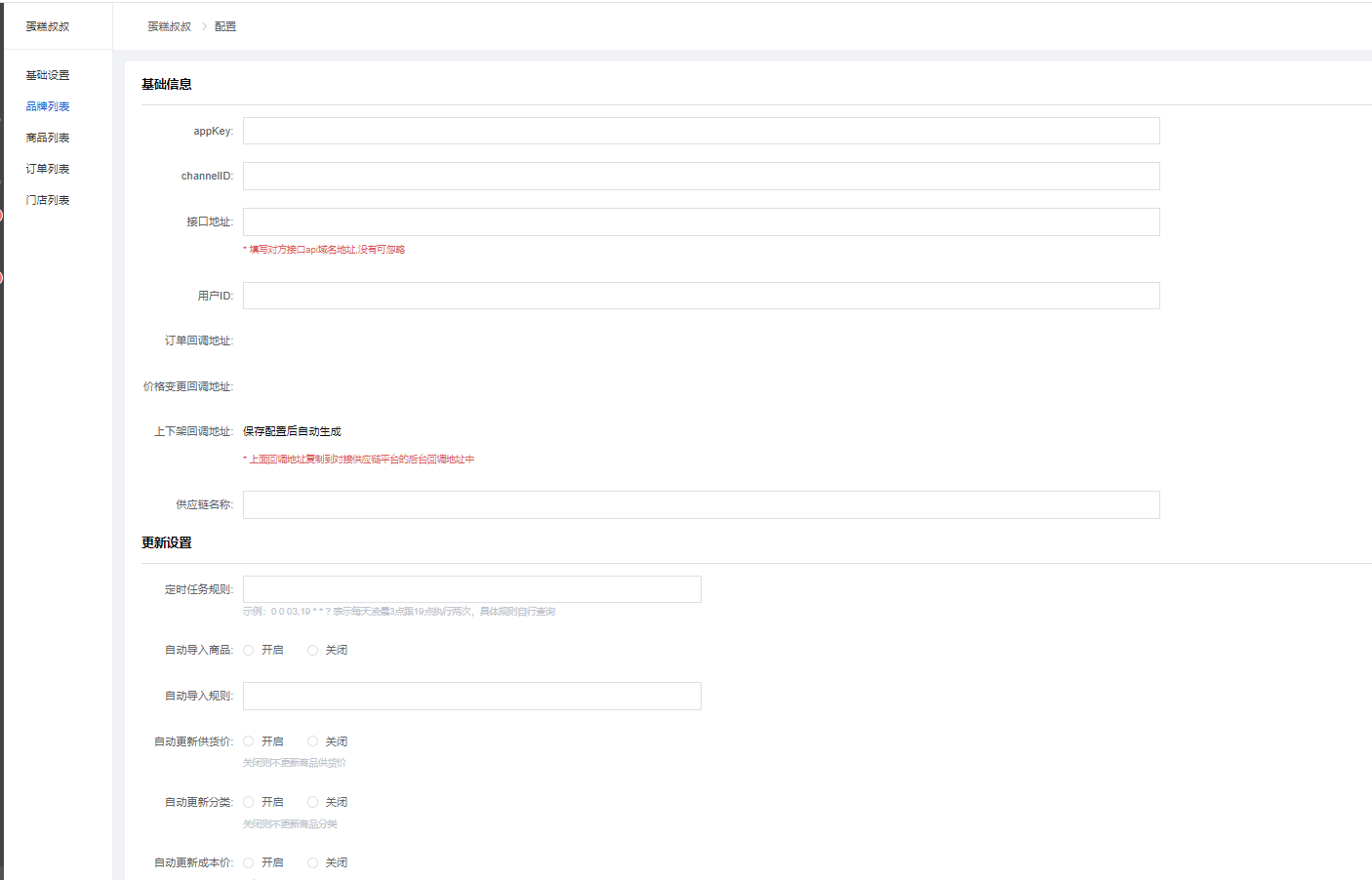 用户ID、订单回调地址、价格变更回调地址、上下架回调地址:填写了上方信息保存后,这部分信息自动生成显示,如对接的第三方平台(蛋糕叔叔平台)有需要填写的,则上面回调地址复制到对接供应链平台的后台回调地址中,不需要填写的话则不用理会。