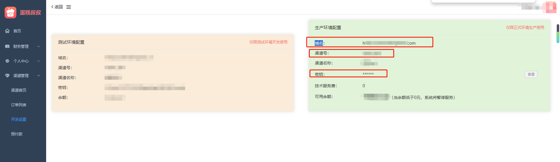appKey、channelID、接口地址:开通蛋糕叔叔平台账户,登录进入–渠道管理–开发设置–复制渠道号填写到中台对应的channelID处、复制密钥填写到中台对应的appKey处、复制域名填写到接口地址处