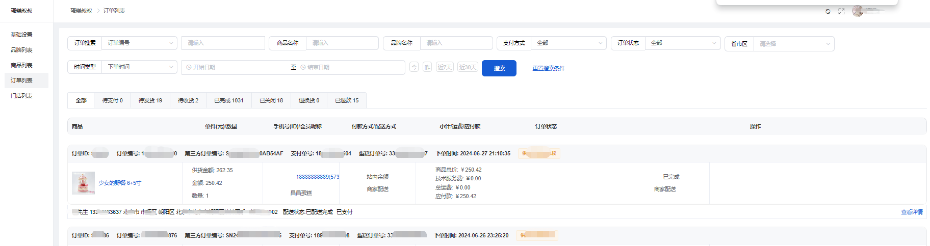 显示蛋糕叔叔订单,可以按订单类型、商品名称、品牌名称、支付方式、订单状态、省市区、时间类型筛选查看订单。