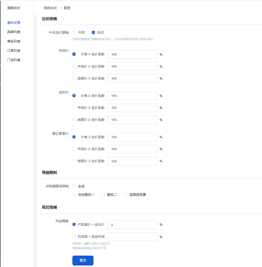 采购端等级限制:针对不同的采购端等级,设置选品限制,如果没勾选,这个等级的采购端就不能选择对应蛋糕叔叔资源的商品