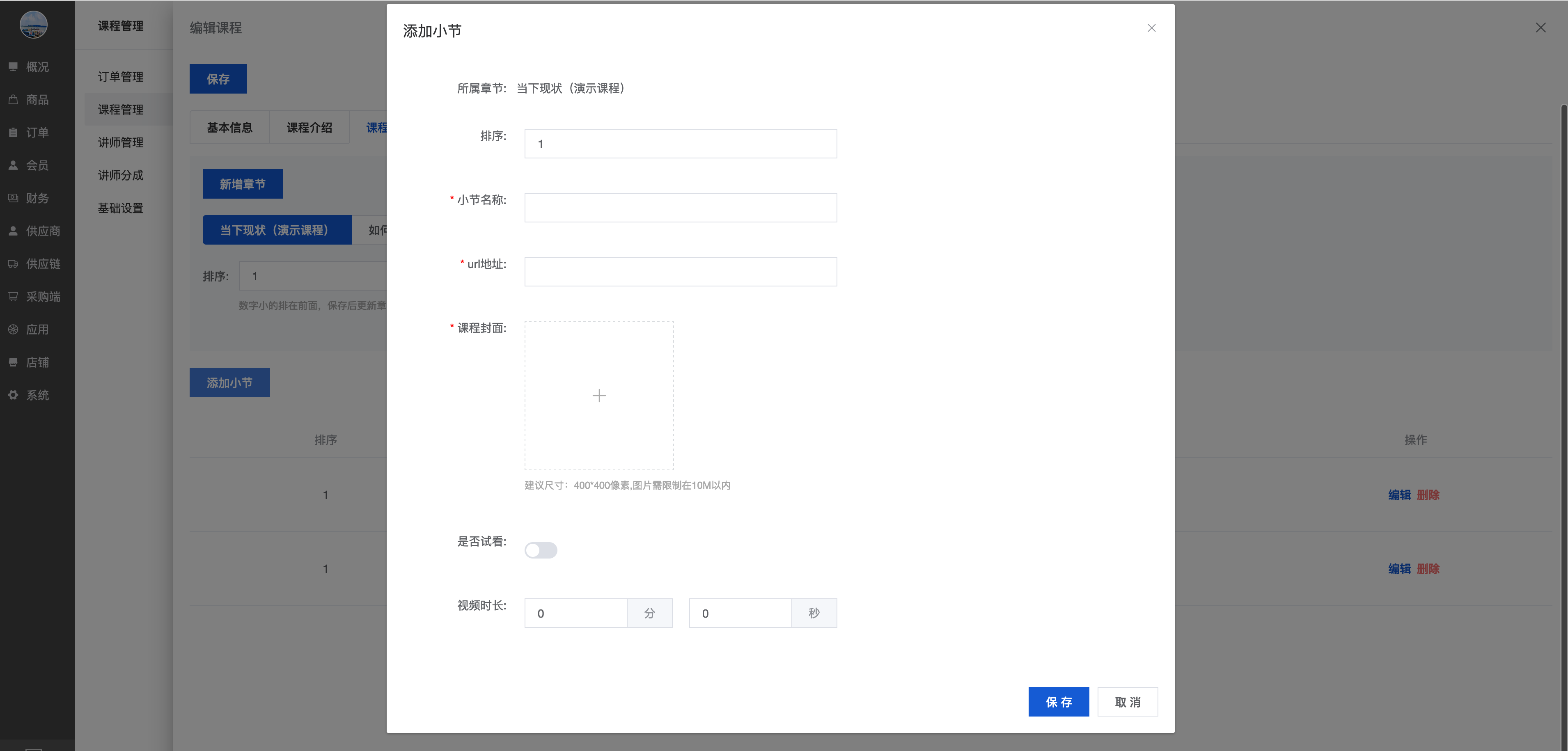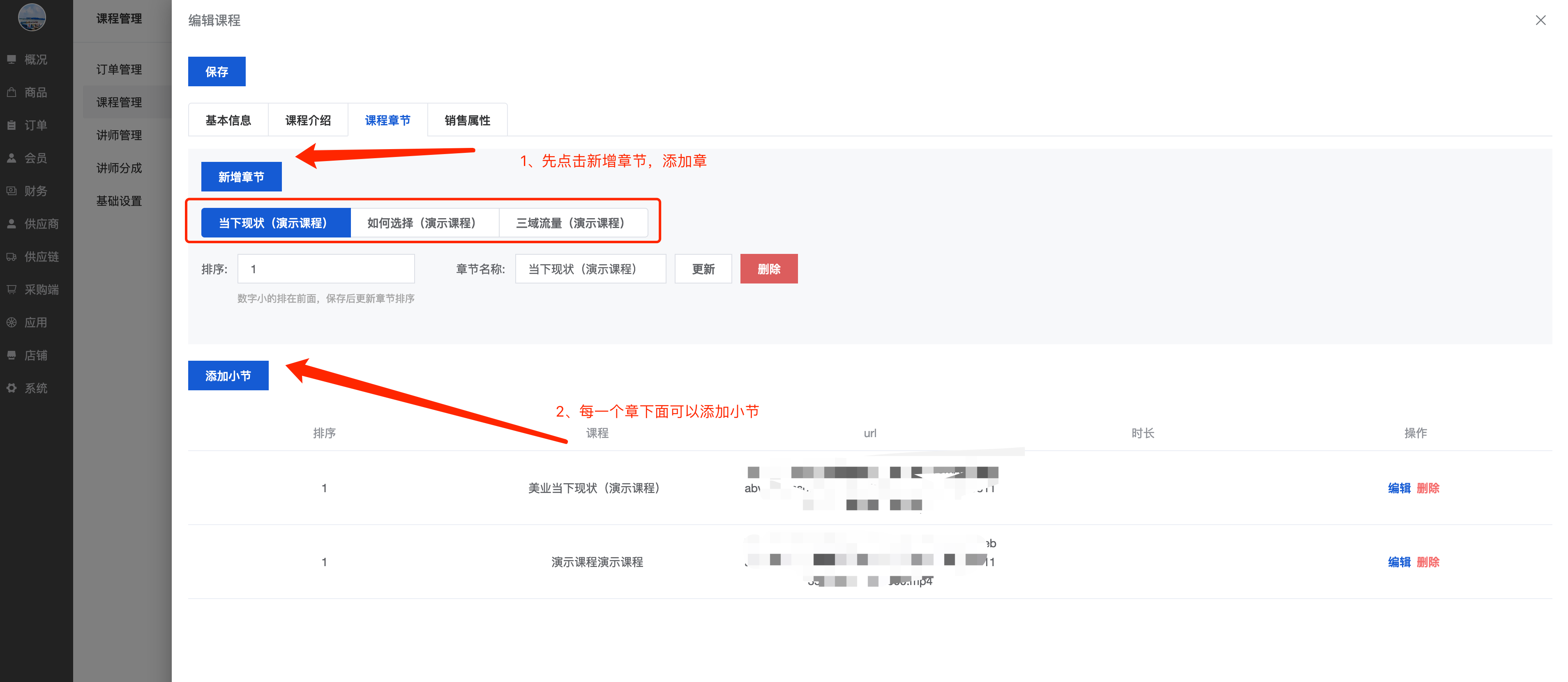点击新增章节添加一个章,添加后点击tab栏可以编辑排序、名称,可以添加章下面的小节课程。