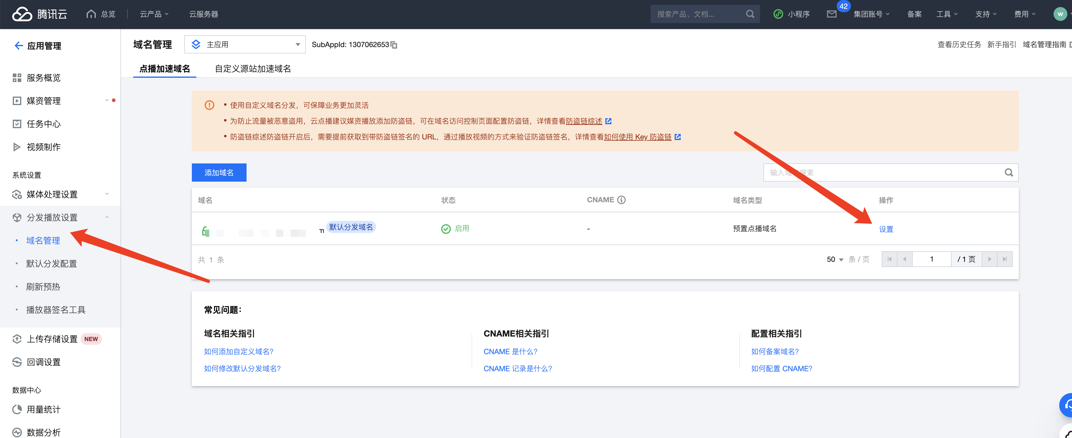 应用管理中进入分发播放设置–域名管理,点击设置。