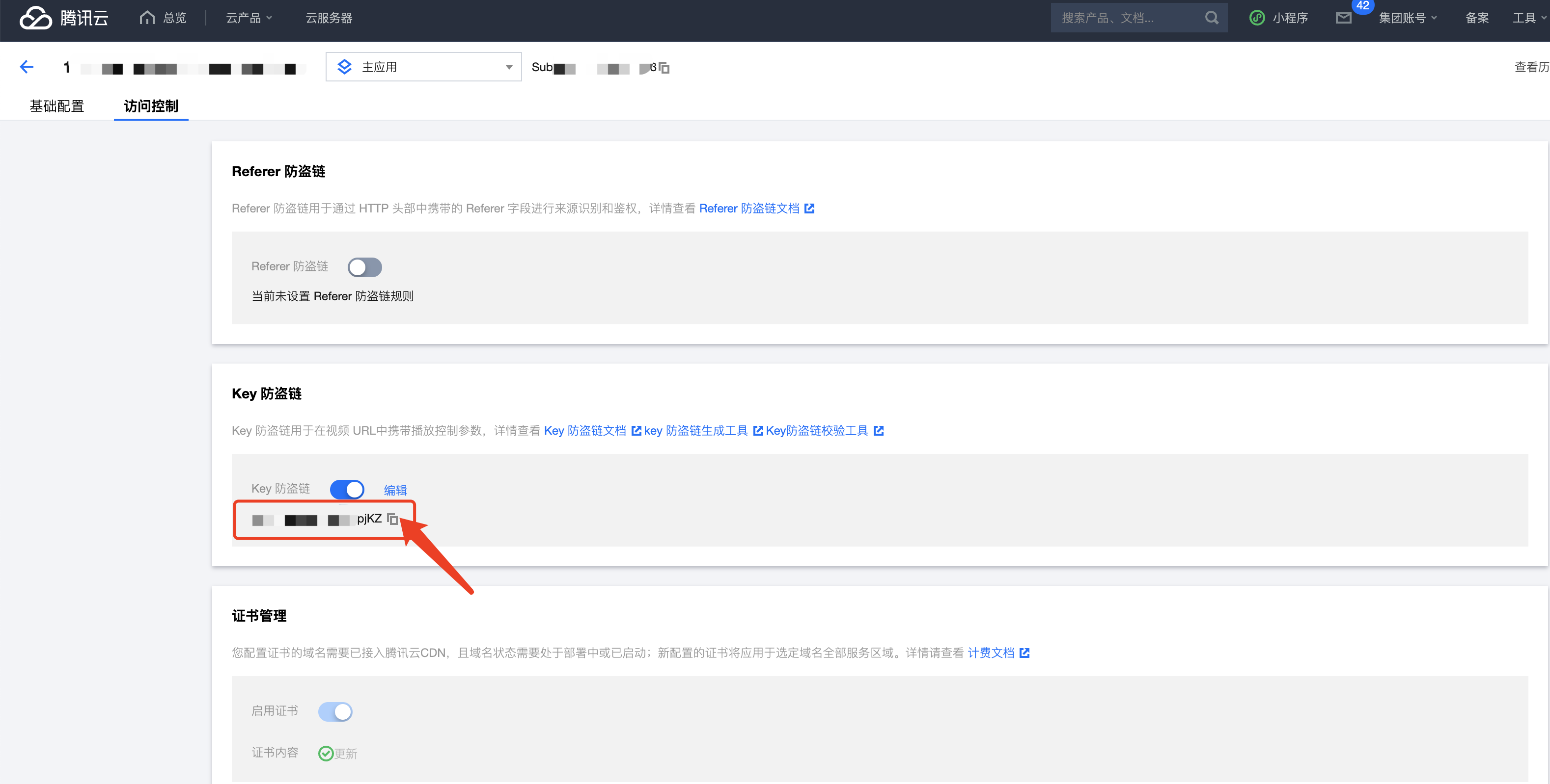 进入访问设置,开启key防盗链,并复制下方的参数填到腾讯云参数设置中。