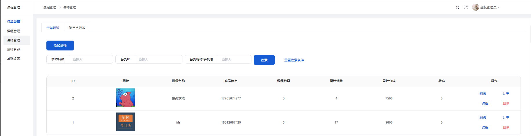 平台讲师支持编辑/删除,点击操作处订单可跳转到订单管理列表查看该讲师对应的订单信息,点击操作处课程则会跳转到课程管理可查看选择了该讲师的课程信息