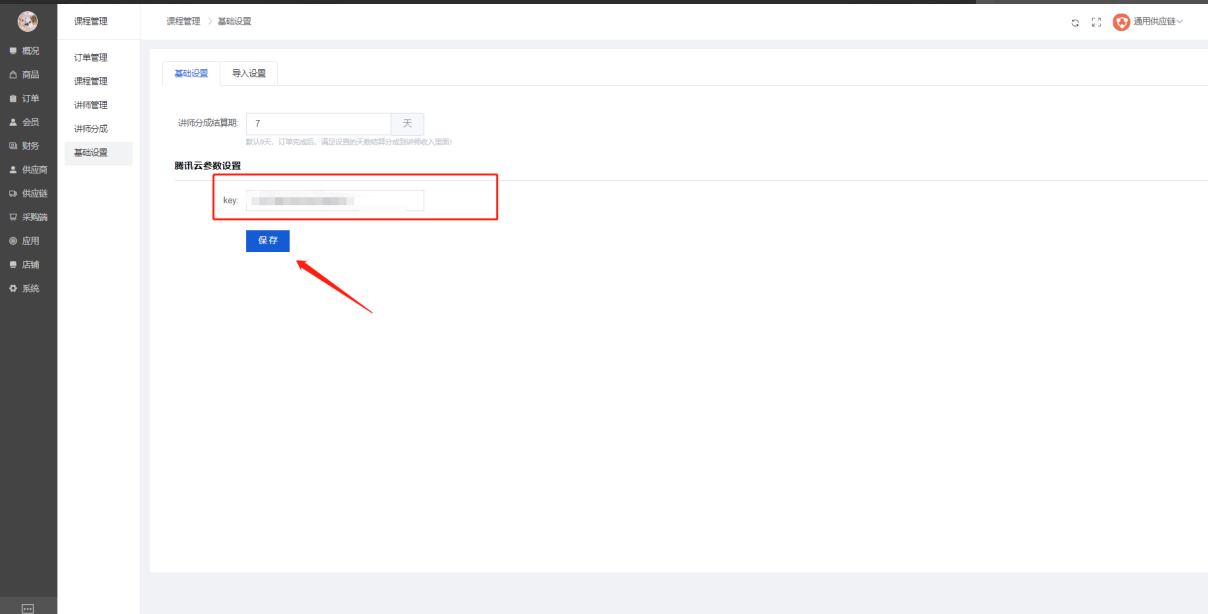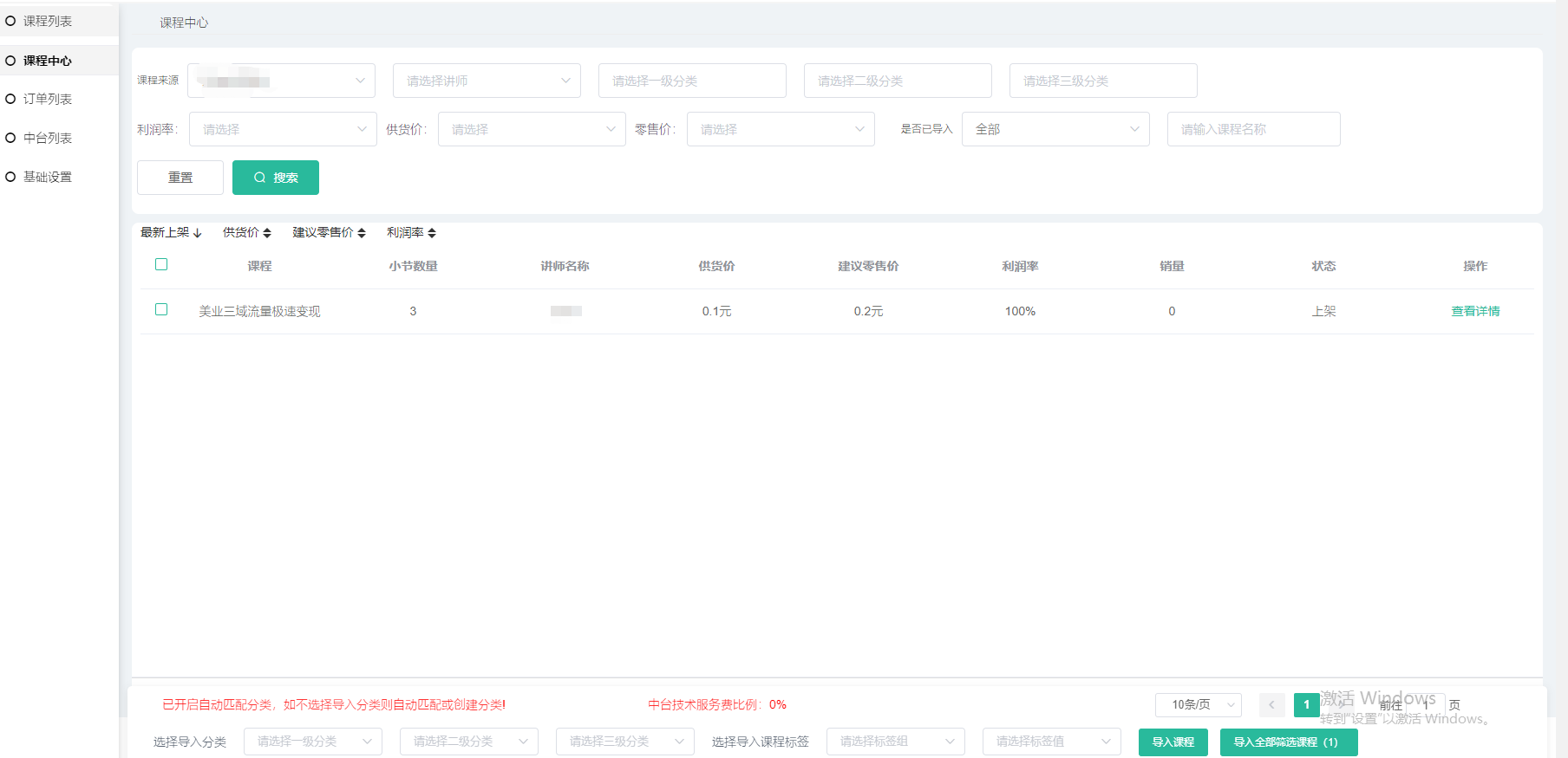 筛选栏:通过课程来源、讲师、分类、利润率、供货价、零售价、课程名称等筛选已导入的课程