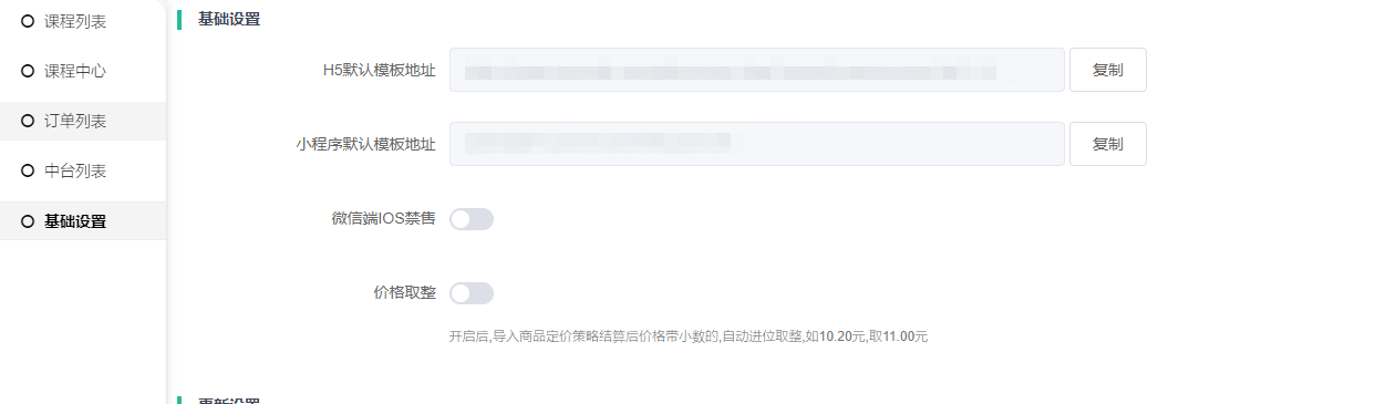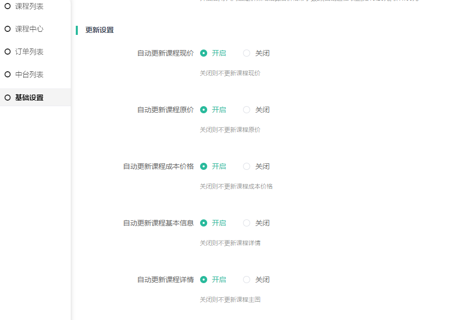 可设置开启更新课程现价,课程原价,课程成本价,课程基本信息,课程详情,开启后,第三方有更新相关商品信息的,可自动推送更新。若关闭则不会自动更新;
