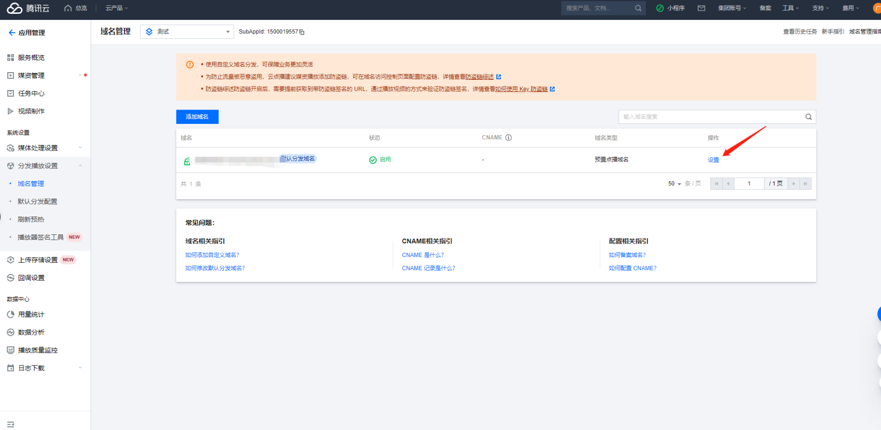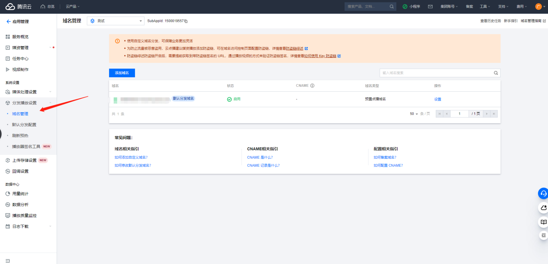 3. 应用管理-系统设置-分发播放设置-域名管理(新创建的应用 会自动配置分发域名)