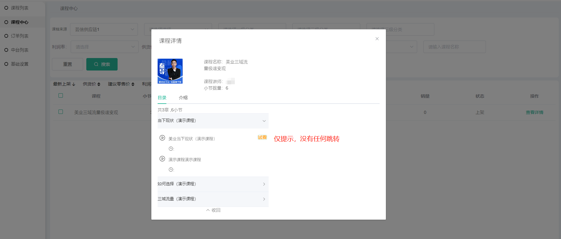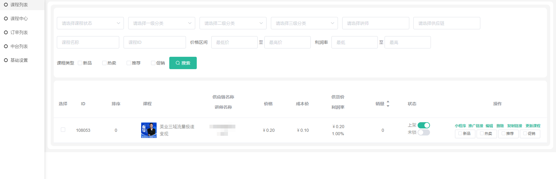 筛选栏:通过课程来源、讲师、分类、利润率、供货价、零售价、课程名称等筛选课程