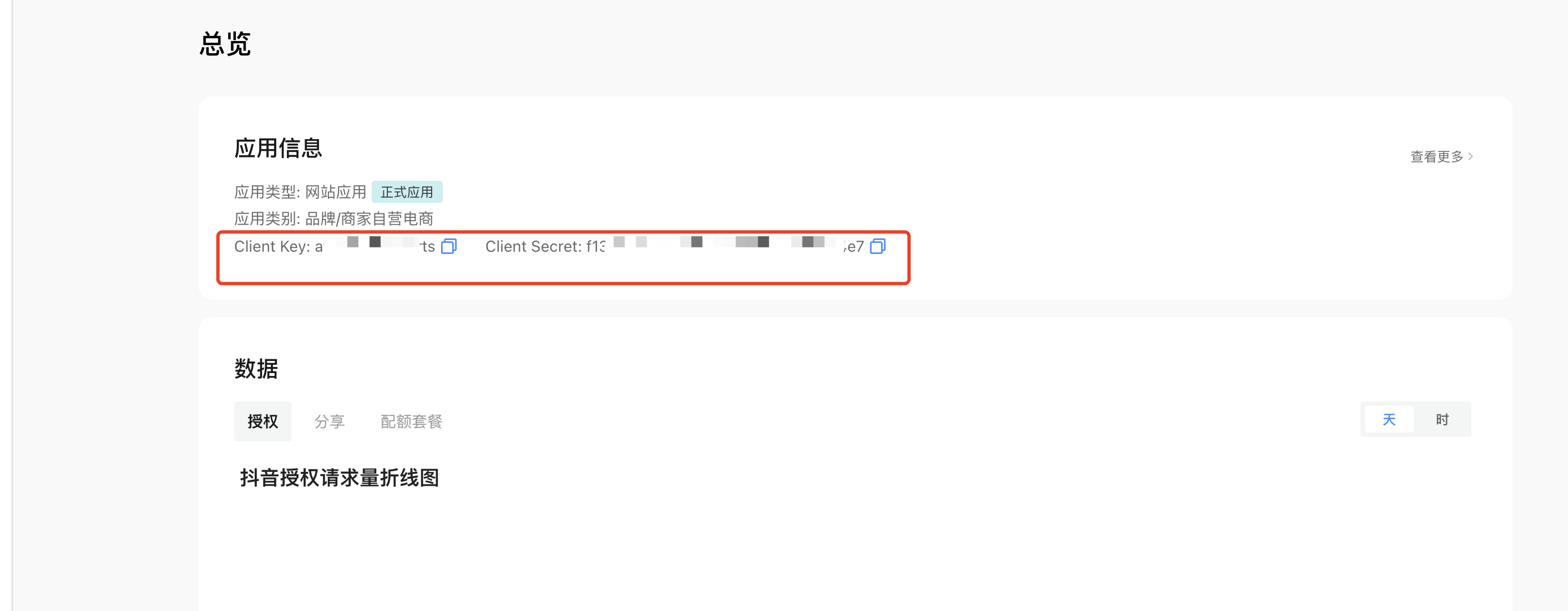 创建后即可获得ClientKey、ClientSecret信息,填入抖音设置–基础设置中即可。