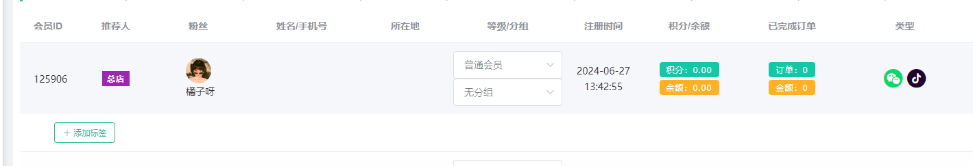 在抖音进行授权登录后会产生一个新的会员ID,会显示抖音类型