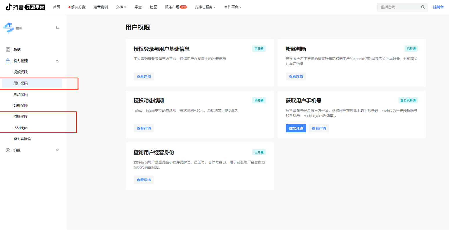 按照上面信息配置后台后,抖音开放平台需要申请用户token和jsb能力等权限,申请安全域名