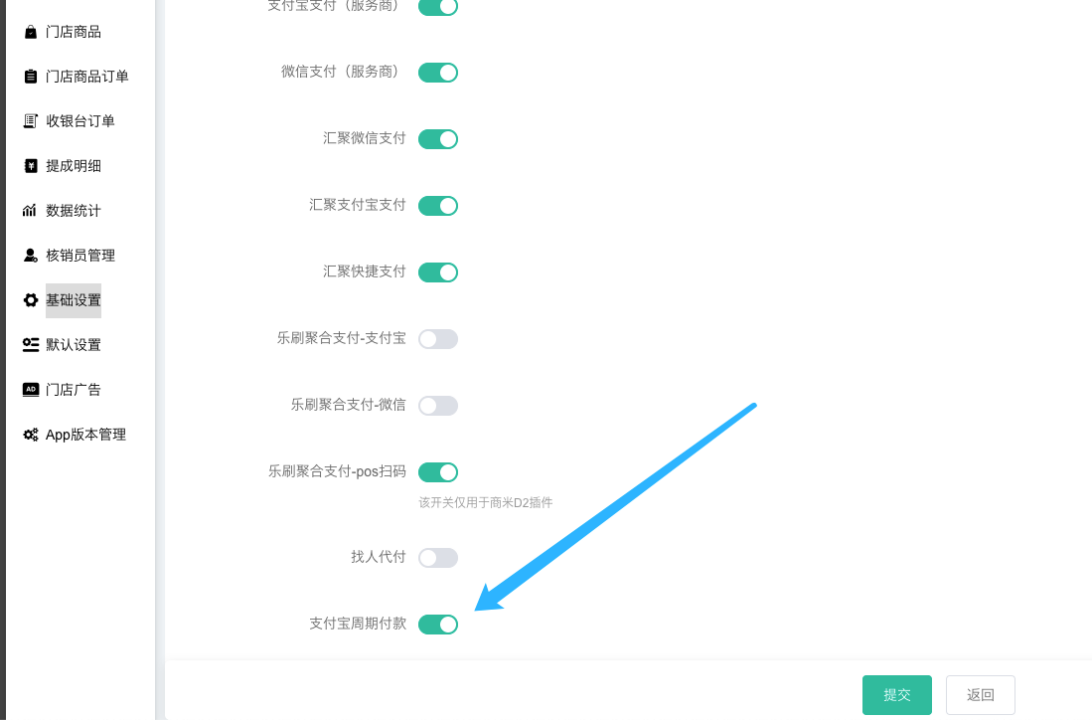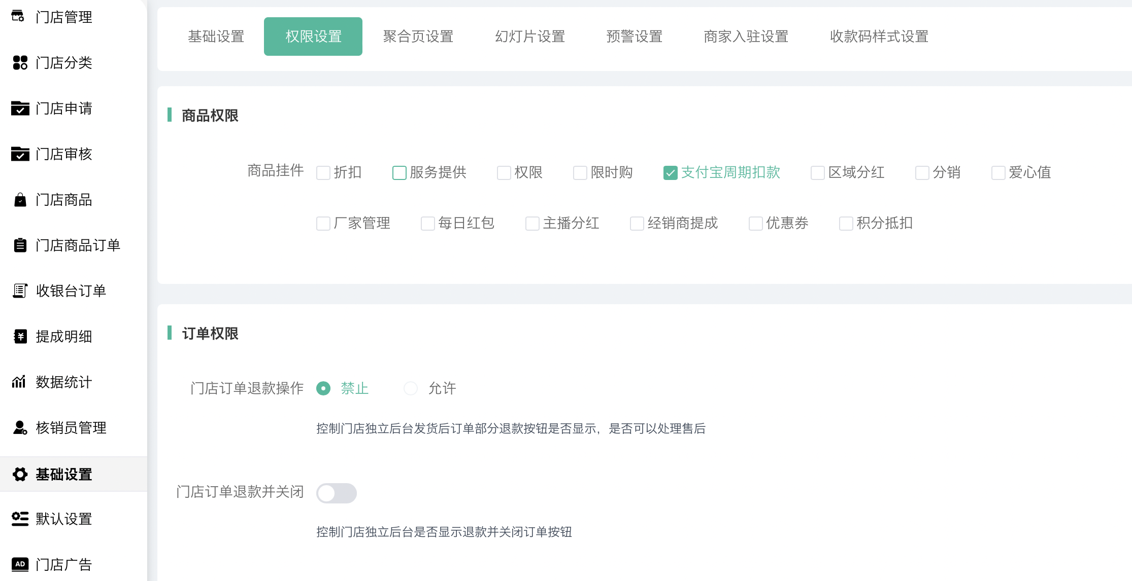 1,基础设置–权限设置,商品权限增加支付宝周期扣款设置,勾选后门店独立后台编辑商品显示支付宝周期扣款挂件;