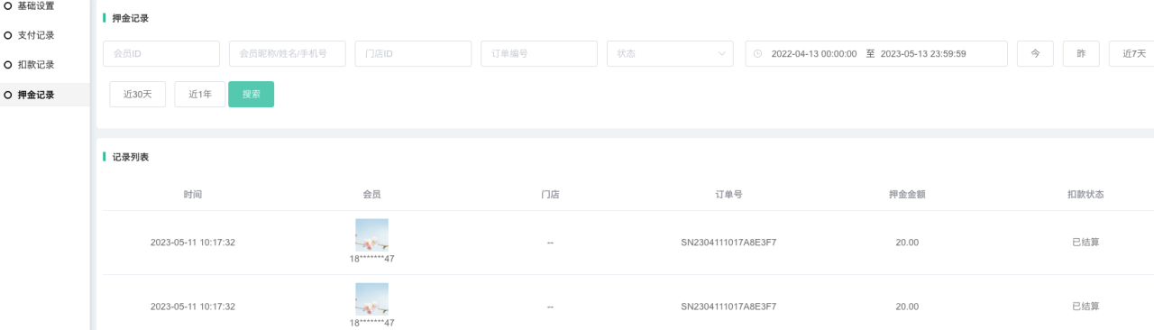 押金记录显示,可查看记录对应时间、会员、门店、订单号、押金金额以及扣款状态;