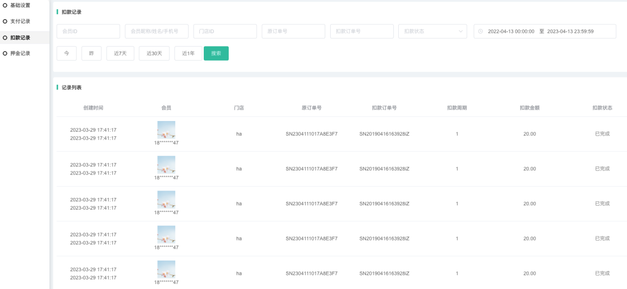 显示扣款记录列表,可查看记录创建时间、会员、门店、原订单号、扣款订单号、扣款周期、扣款金额以及扣款状态;