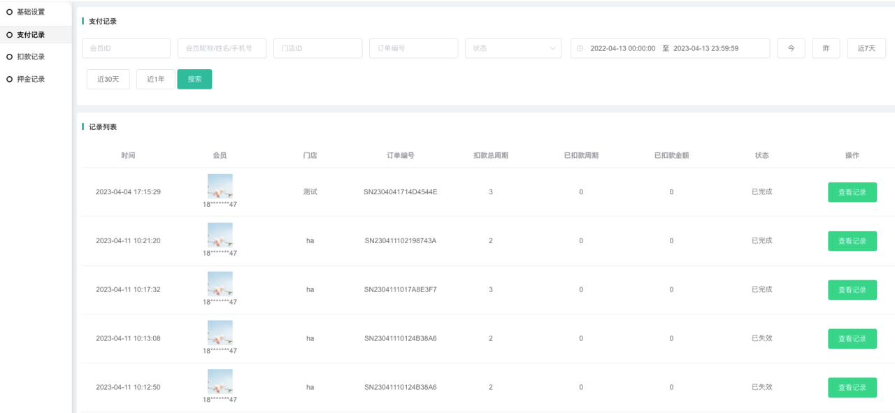 显示支付记录列表,可查看支付时间、会员、门店、订单编号、扣款总周期、已扣款周期以及状态等;可按会员信息、门店等搜索查看对应记录;