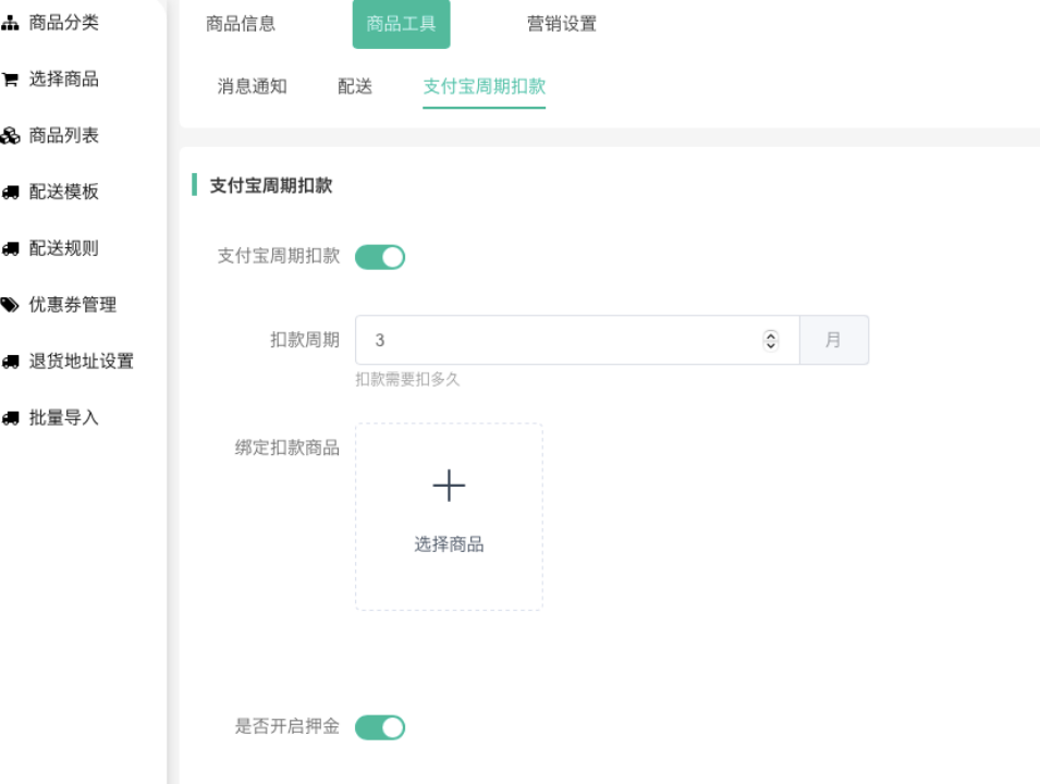 开启支付宝周期扣款,可以单独设置商品的扣款周期,绑定扣款商品,可以选择是否开启押金;