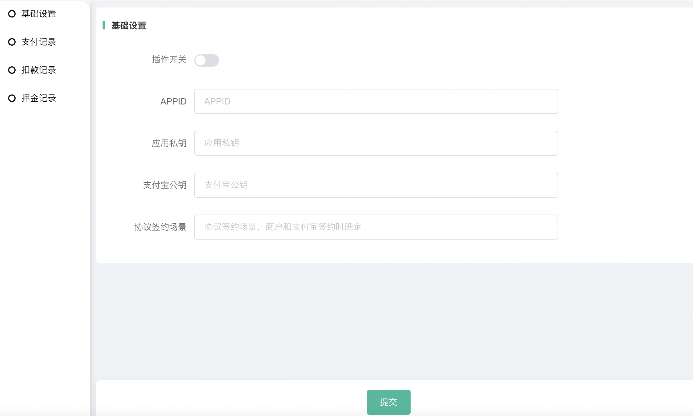 开启插件,填写对应APPID/应用私钥/支付宝公钥;协议签约场景,按照支付宝签约的场景对应填写。