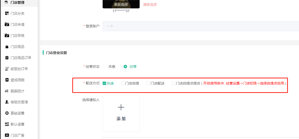 开启权限在门店-收银台—门店管理-门店信息-门店营业设置-配送方式设置