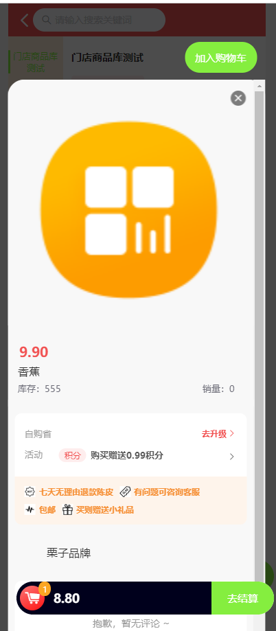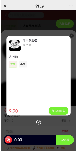 单规格商品点击商品弹出商品详情,上方可以点击加入购物车