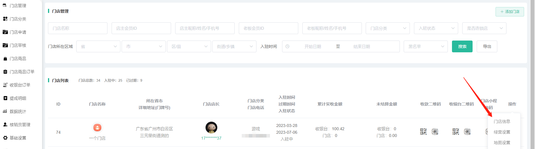 筛选栏:通过门店ID、门店名称、店主ID、开启状态 搜索数据