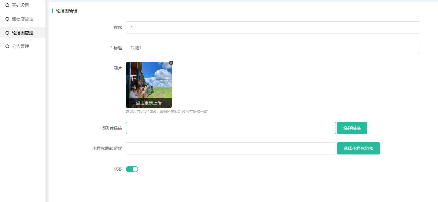 添加轮播图设置排序(数字越大则排在前),标题,图片,跳转链接(在前端点击图片则会跳转到设置的链接页面),状态