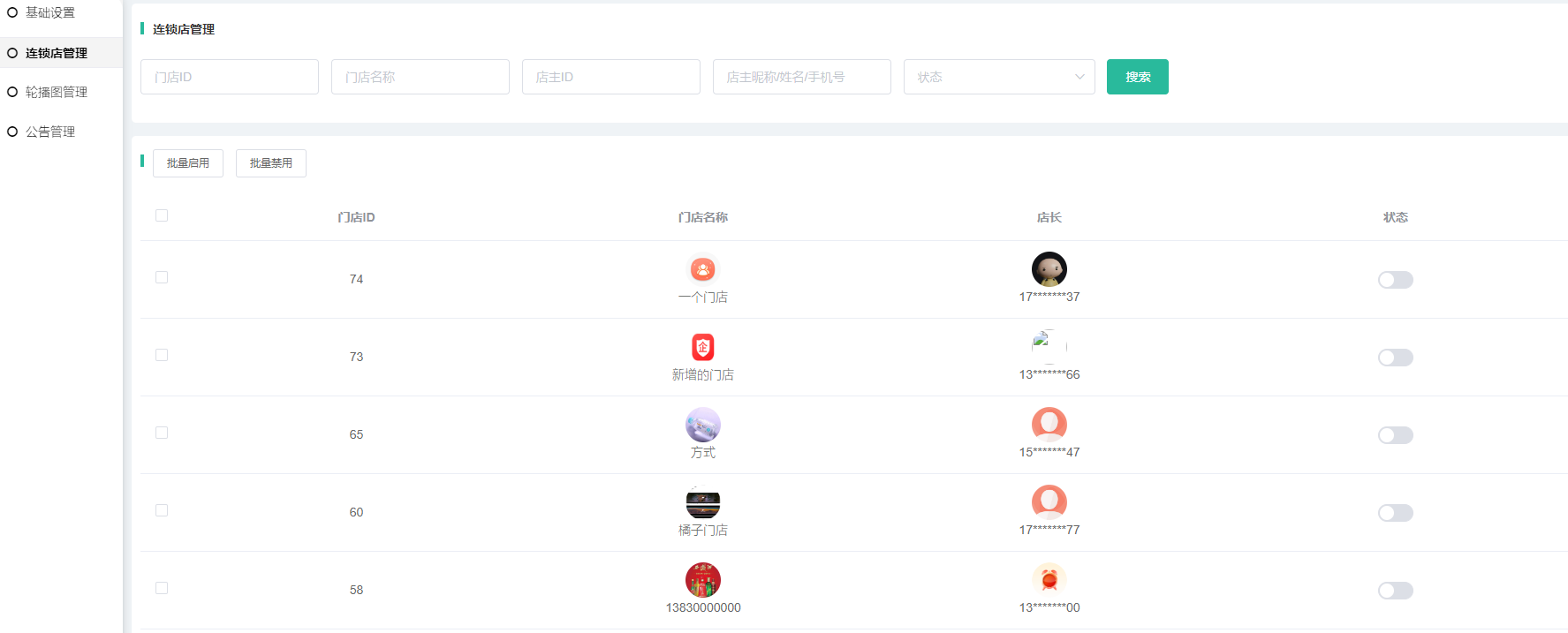 列表:显示门店ID、门店名称、门店店长、控制连锁店开启的状态