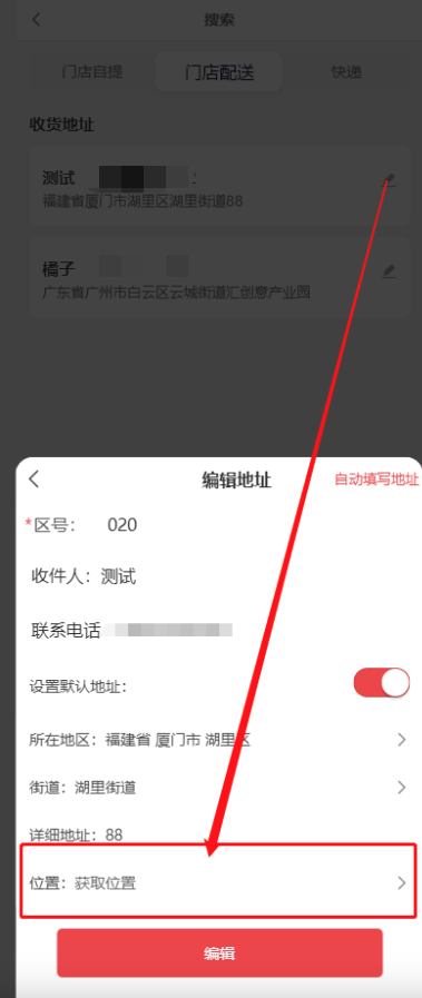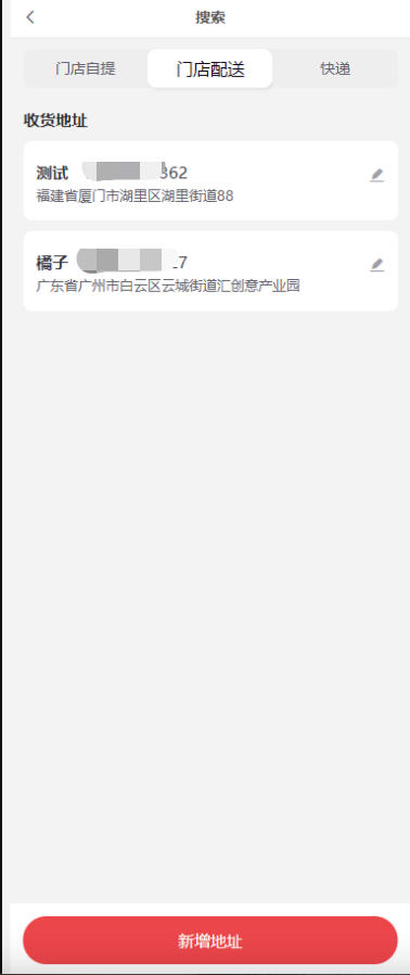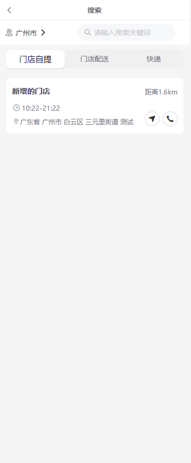 门店配送:显示当前客户的收货地址(需要获取地址的位置信息才可以使用),点击地址会根据距离地址最近的门店显示
