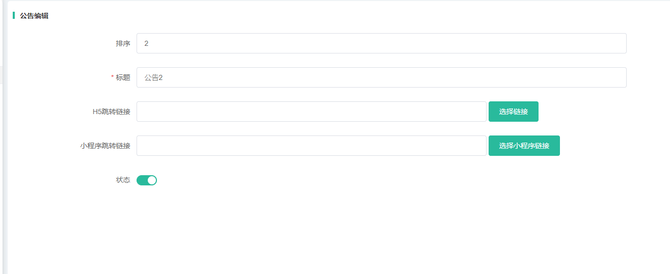 添加轮播图设置排序(数字越大则排在前),标题,图片,跳转链接(在前端点击公告则会跳转到设置的链接页面),状态