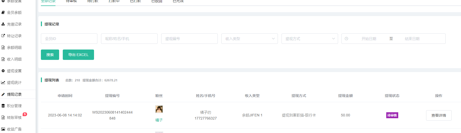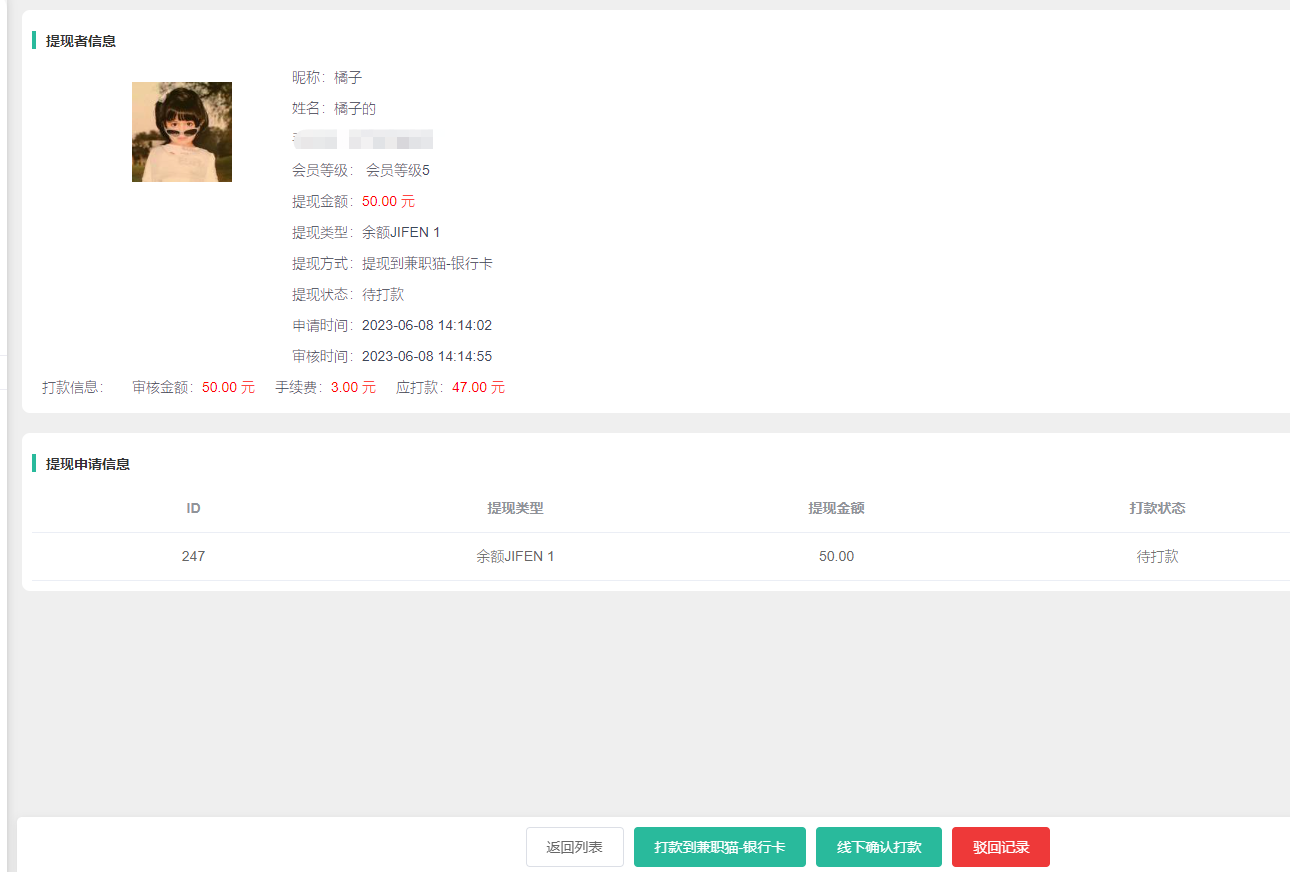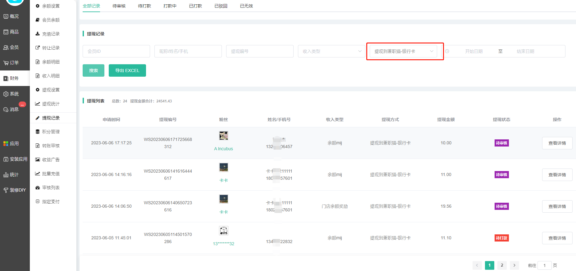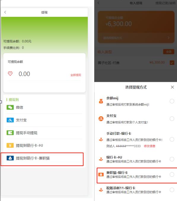 商城后台-财务-提款信息: 新增 ‘提款到兼职猫-银行卡’ 提款方式